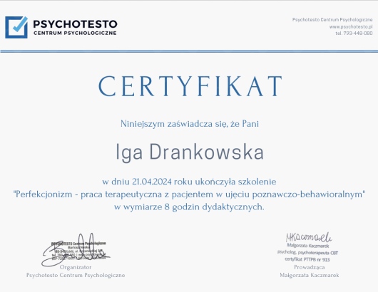 Gdzie Iga Drankowska ma swój gabinet?Iga Drankowska nie ma określonego adresu gabinetu. Możliwe, że Iga Drankowska przyjmiuje tylko online lub nie chce podawać dokładnego adresu.