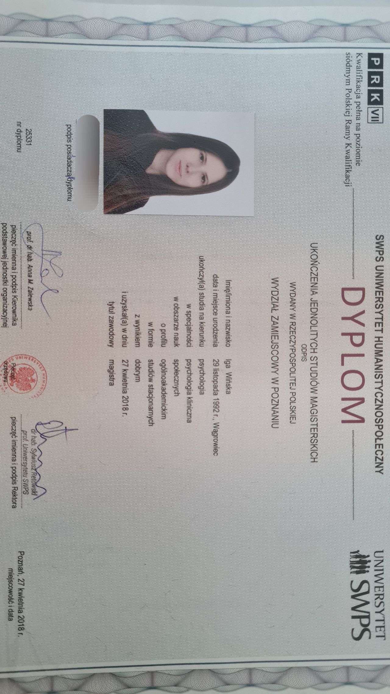 Jestem psychologiem oraz certyfikowaną specjalistką psychoterapii uzależnień. Szkolę się w nurcie psychoterapii psychodynamicznej w Krakowskim Centrum Psychodynamicznym.