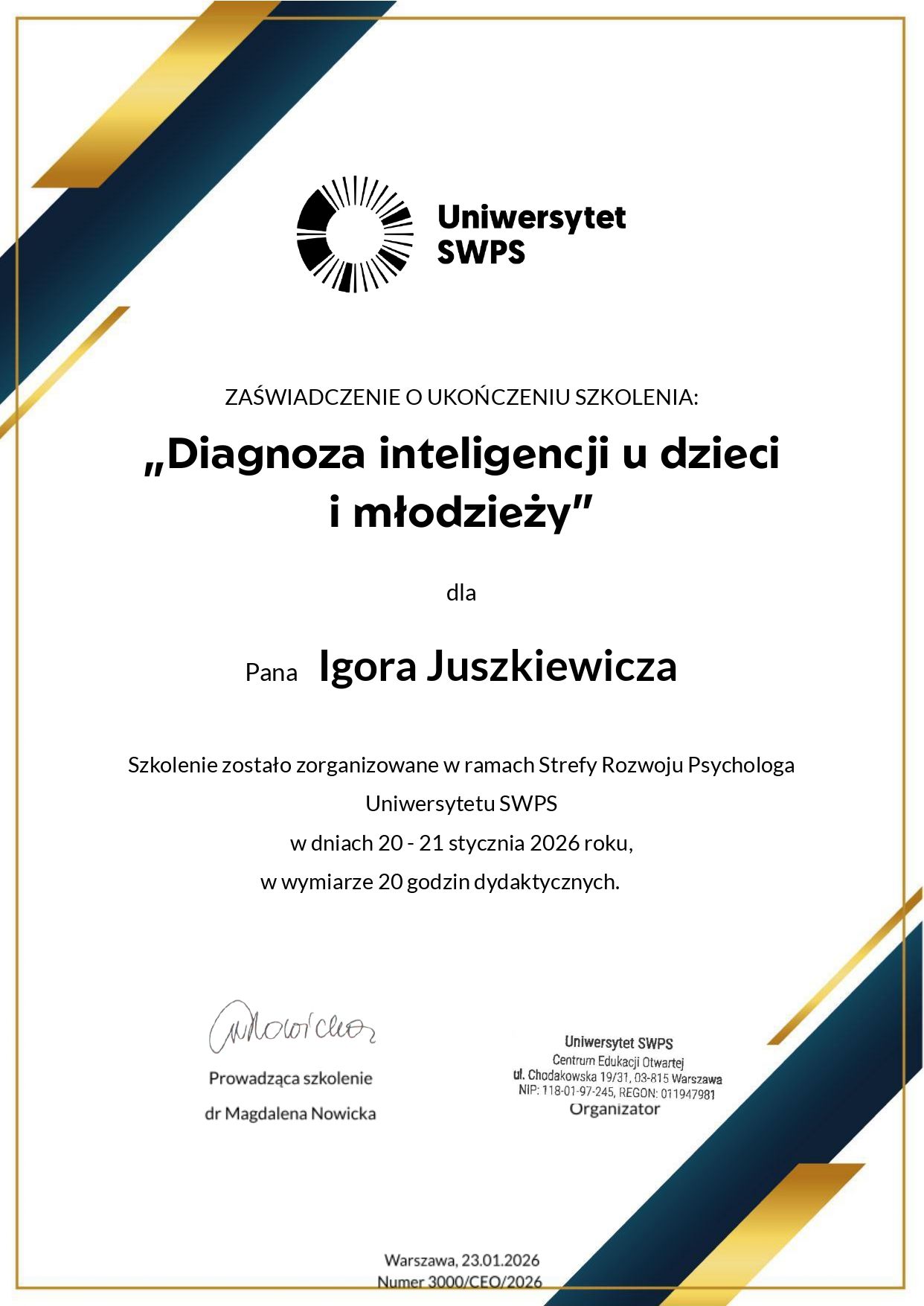 Swoje doświadczenie zawodowe zdobywałem zarówno w Polsce, jak i za granicą, w poradniach psychologiczno-pedagogicznych oraz w prywatnych placówkach zdrowia psychicznego. Posiadam uprawnienia do stosowania kluczowych testów psychologicznych wykorzystywanych w diagnozie spektrum autyzmu i ADHD u dzieci i dorosłych, a także w badaniu poziomu funkcjonowania intelektualnego. Jestem również trenerem umiejętności społecznych (TUS).