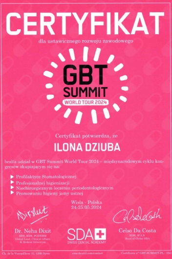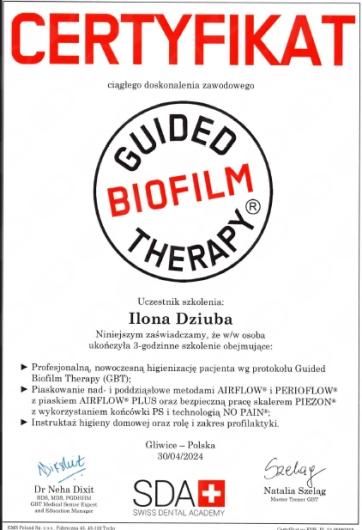 Dzięki mojej kompetencji i doświadczeniu, każdy zabieg higienizacji przeprowadzany jest zgodnie z najwyższymi standardami zgodnie z protokołem GBT. Regularnie uczestniczę w szkoleniach i kursach, aby być na bieżąco z najnowszymi technikami i innowacjami w dziedzinie higieny stomatologicznej.
