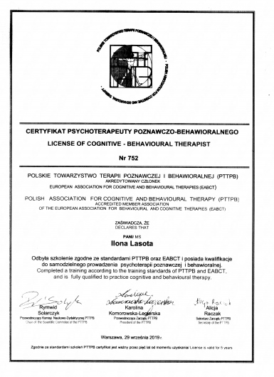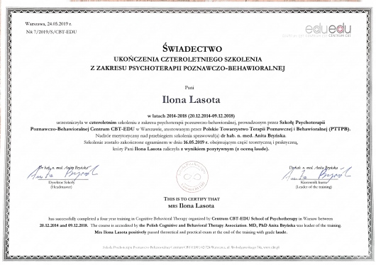 Pani Ilona jest świetną specjalistką. Dzięki jej pomocy nauczyłam się lepiej rozumieć siebie i swoje emocje, lepiej nimi zarządzać. Wiele dotychczasowych problemów zostało rozwiązanych, bądź nauczyłam się radzić sobie z nimi. W gabinecie panuje bardzo przyjazna atmosfera, można się tam czuć bezpiecznie. Serdecznie polecam współpracę z Panią Iloną.