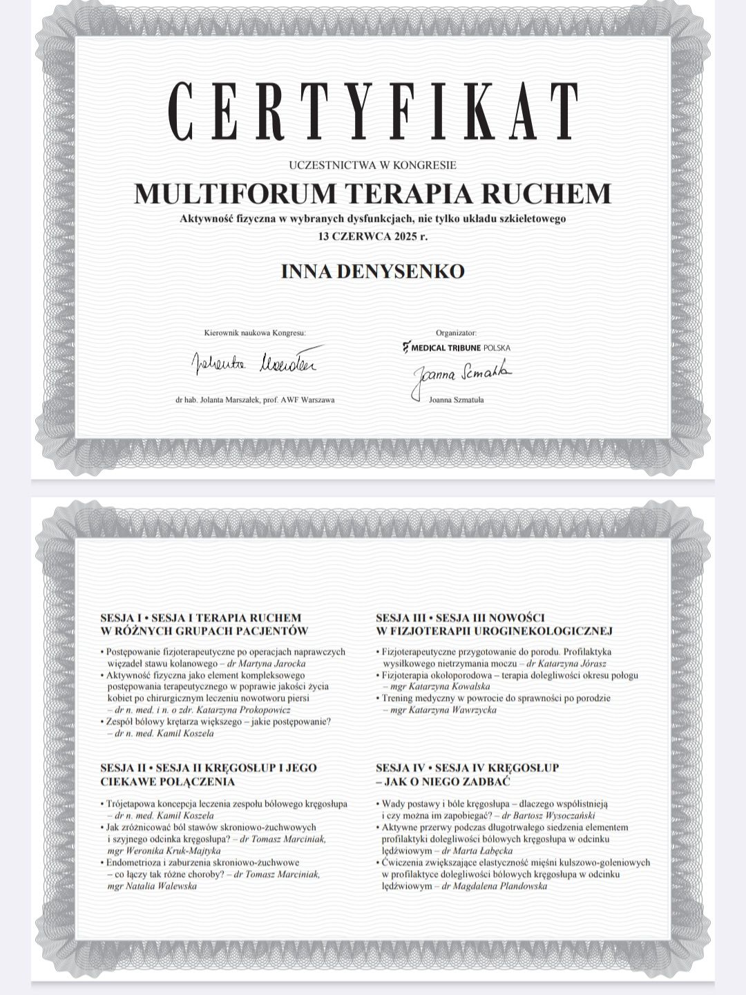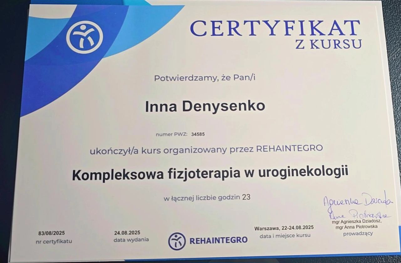 Jaki jest zakres porad oferowanych przez Inna Denysenko?Inna Denysenko to fizjoterapeuta. Na podstawie swojego doświadczenia i wykształcenia Inna Denysenko oferuje usługi takie jak: konsultacja fizjoterapeutyczna (pierwsza wizyta), konsultacja fizjoterapeutyczna dzieci, Terapia manualna, fizjoterapia uroginekologiczna, Drenaż limfatyczny, terapia stawów skroniowo-żuchwowych, Masaż Kobido (wizyta pierwszorazowa), terapia wad postawy, masaż Kobido, drenaż limfatyczny 60 minut.