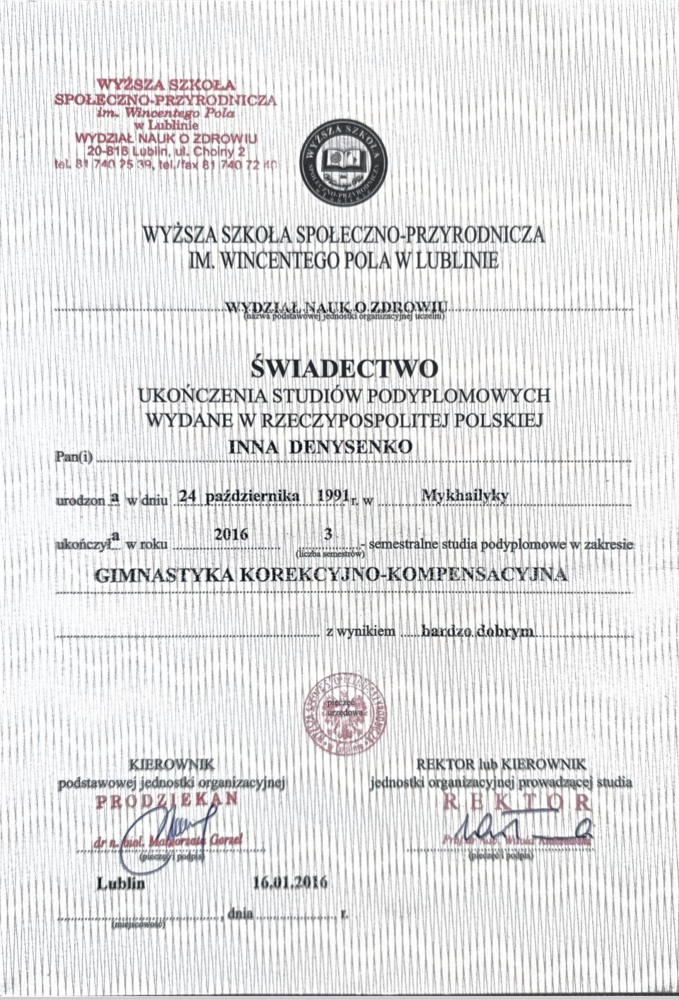 Magister fizjoterapii Wyższej Szkoły Społeczno-Przyrodniczej w Lublinie. Swoje doświadczenie zdobywałam w Polsce i we Włoszech. Nie traktuję swojej pracy jako obowiązek, a jako przyjemność z przywracania pacjentów do pełni sprawności fizycznej. Moją specjalnością są fizjoterapia dzieci i niemowląt, uroginekologiczna, neurologiczna, sportowa, oraz terapia suchym igłowaniem i terapia skroniowa zuchwy, a pasją jest pomaganie ludziom poprzez rozwiązywanie ich problemów związanych z narządem ruchu. Aby osiągnąć sukces przy powrocie pacjenta do pełni sprawności należy połączyć odpowiedni plan fizjoterapii oraz aktywny udział samego pacjenta.