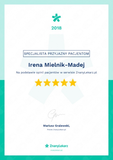 Irena Mielnik-Madej: co mówią pacjenci?135 osób dodało swoją opinię. Irena Mielnik-Madej ma średnią ocen 5 (na 5 gwiazdek).