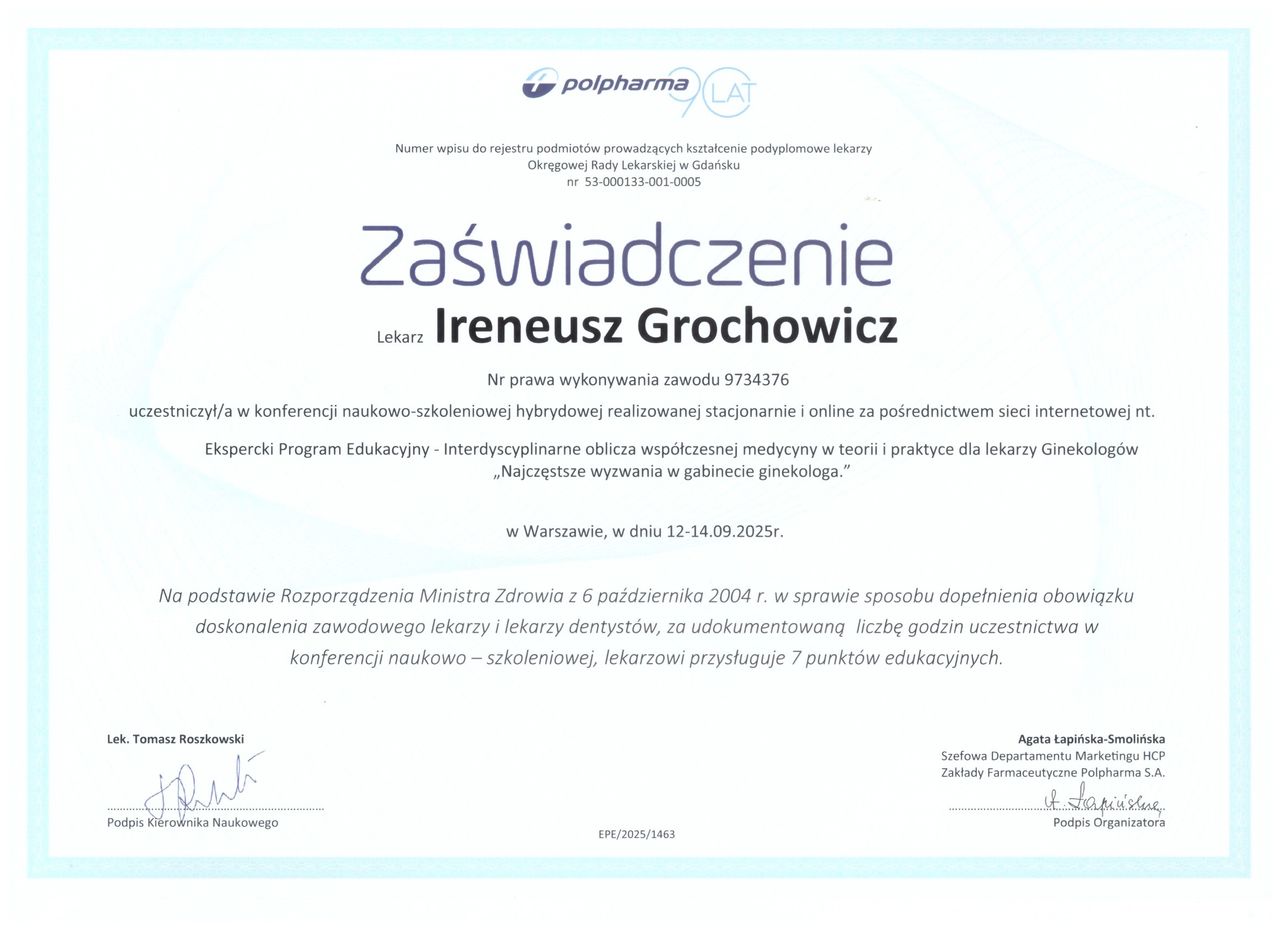 Jaki jest zakres porad oferowanych przez Ireneusz Grochowicz?Ireneusz Grochowicz to ginekolog. Na podstawie swojego doświadczenia i wykształcenia Ireneusz Grochowicz oferuje usługi takie jak: USG ginekologiczne, KTG - kardiotokografia, implanty, Antykoncepcja, cytologia, badania biochemiczne, krioterapia, wkładka domaciczna, diagnostyka niepłodności, laseroterapia zmian ginekologicznych.