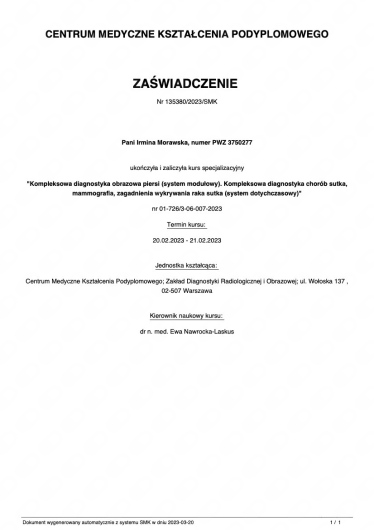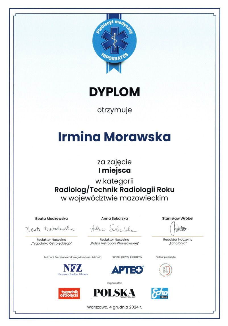 Biegle władam językiem angielskim. Jestem aktywną uczestniczką wielu konferencji naukowych i kongresów medycznych na poziomie krajowym i międzynarodowym, a także recenzentką i współautorką impaktowanych publikacji naukowych w renomowanych czasopismach medycznych m. in w European Radiology. Nieustannie pogłębiam swoją wiedzę biorąc udział w licznych kursach i szkoleniach. W grudniu 2024 roku otrzymałam tytuł "Radiologa Roku" w województwie mazowieckim w Plebiscycie Medycznym Hipokrates 2024. W kwietniu 2025 roku zostałam nagrodzona grantem "The Rising Star Radiology Grant" od Société Française de Radiologie, a w czerwcu 2025 roku otrzymałam nagrodę ESGAR Top 20 Award podczas corocznego Kongresu ESGAR w Amsterdamie.