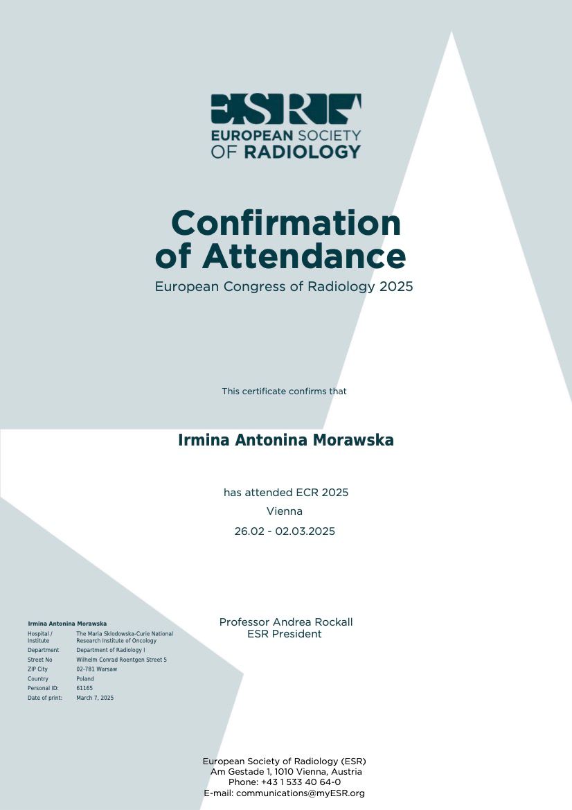 I am a graduate of the Faculty of Medicine at the Medical University of Silesia in Katowice, Poland. I did my postgraduate internship at the 5th Military Clinical Hospital in Cracow, Poland. I am currently in the course of specialisation in radiology and diagnostic imaging at the Department of Radiology of the Maria Sklodowska-Curie National Research Institute of Oncology in Warsaw, where I deal with cancer diagnostics. There I am also preparing my doctoral thesis on imaging of the assessment of the response to systemic treatment of colorectal liver metastases in MRI. I am fluent in English. I am an active participant in many scientific conferences and medical congresses at national and international level, as well as a reviewer and co-author of impacted scientific publications in renowned medical journals incl. European Radiology. I am continuously improving my knowledge by taking part in numerous courses and trainings. In December 2024, I was awarded the title of ‘Radiologist of the Year’ in the Mazovian Voivodeship in the Hippocrates 2024 Plebiscite. In April 2025, I was awarded The Rising Star Radiology Grant from the Société Française de Radiologie, and in June 2025, I received the ESGAR Top 20 Award at the annual ESGAR Congress in Amsterdam.