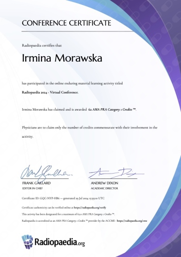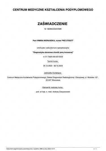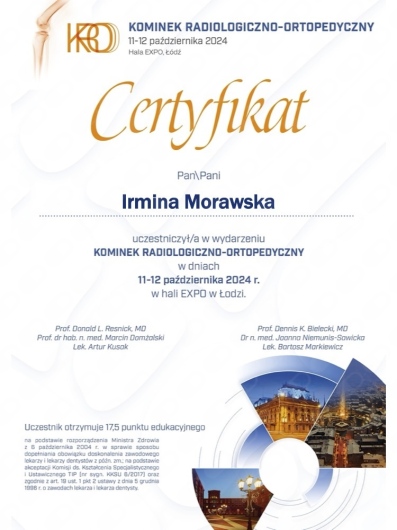 I am the President of the Residents' Council within the Polish Medical Society of Radiology (PLTR). Additionally, I hold the position of Secretary in both the Mazovian Branch of PLTR and the Scientific Section of Gastrointestinal Radiology of PLTR. I have gained international experience through scientific internships in prestigious clinics in Slovakia, Oman, Portugal and Denmark. I achieved a Certificate of Skills in General Diagnostic Ultrasound of the Polish Medical Society of Radiology.