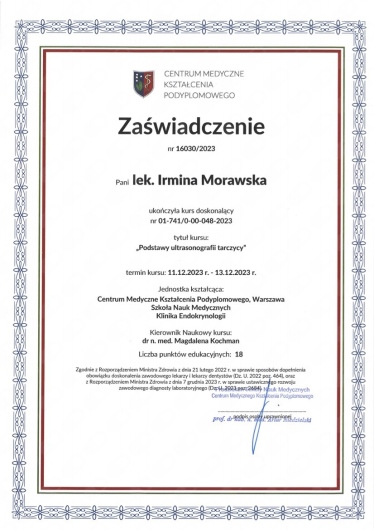 Jaki jest zakres porad oferowanych przez Irmina Morawska?Irmina Morawska to w trakcie specjalizacji (radiolog), ultrasonografista. Na podstawie swojego doświadczenia i wykształcenia Irmina Morawska oferuje usługi takie jak: USG tarczycy, USG jamy brzusznej, USG węzłów chłonnych, USG, USG węzłów chłonnych pachowych, USG węzłów chłonnych pachwinowych, USG węzłów chłonnych szyjnych, USG ślinianek, USG układu moczowego.