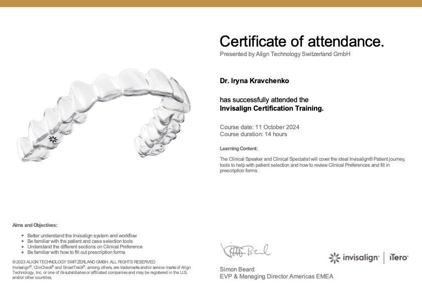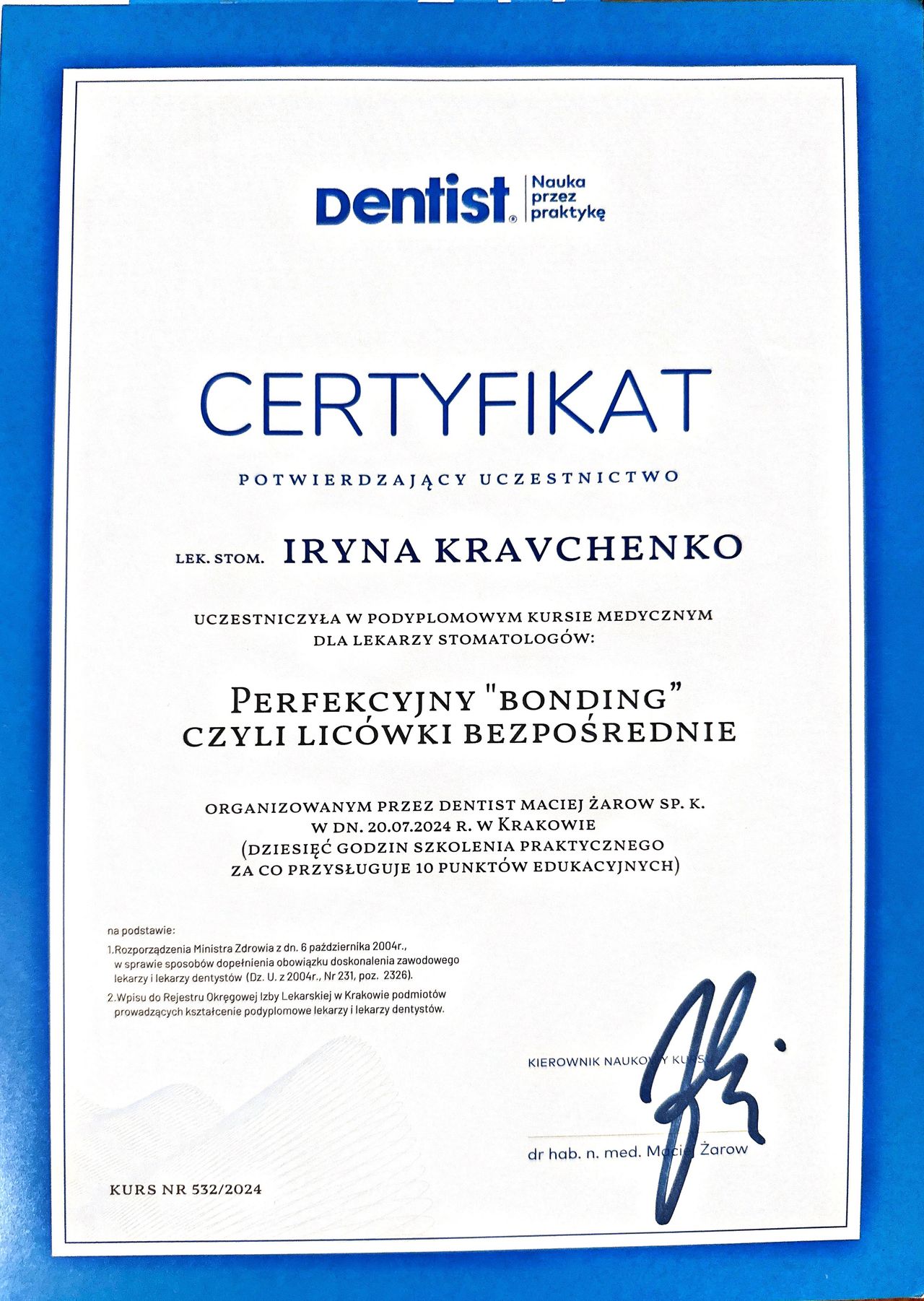 Jaki jest zakres porad oferowanych przez Iryna Kravchenko?Iryna Kravchenko to stomatolog. Na podstawie swojego doświadczenia i wykształcenia Iryna Kravchenko oferuje usługi takie jak: Konsultacja stomatologiczna, Stomatologia zachowawcza, leczenie zachowawcze, wypełnienie kompozytowe, wypełnienie zęba materiałem światłoutwardzalnym, leczenie próchnicy, odbudowa zęba po urazie materiałem kompozyt., Odbudowa zniszczonego zęba, diagnostyka RTG/CBCT.