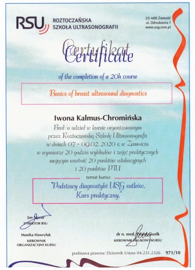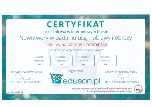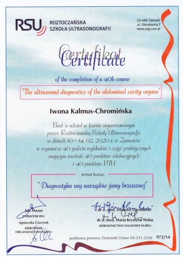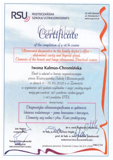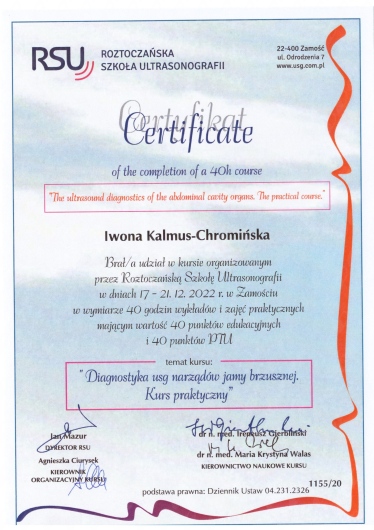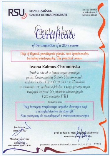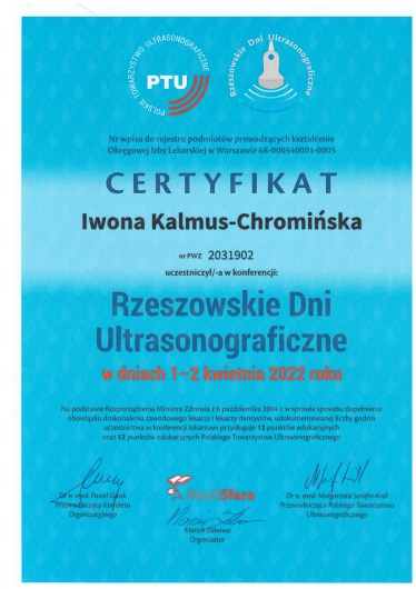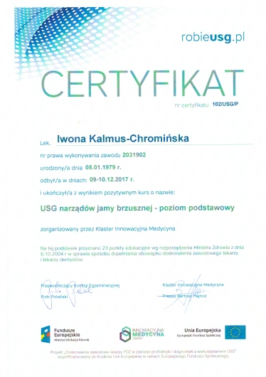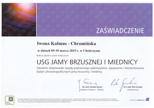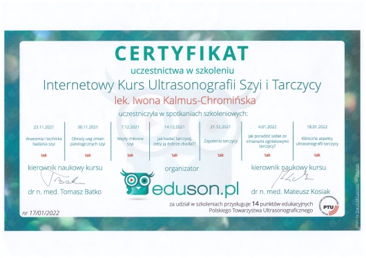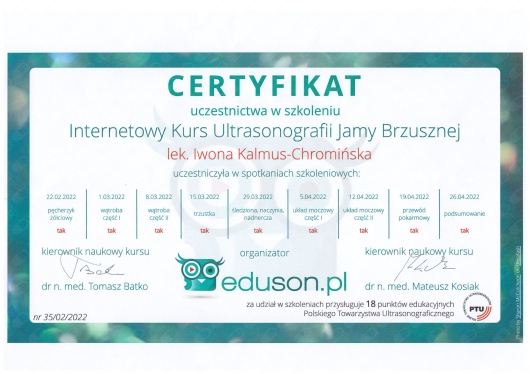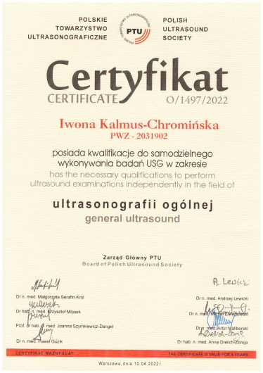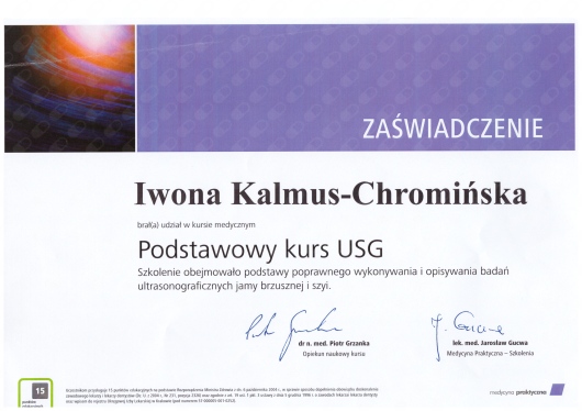 Jaki jest zakres porad oferowanych przez Iwona Anna Kalmus-Chromińska?Iwona Anna Kalmus-Chromińska to ultrasonografista. Na podstawie swojego doświadczenia i wykształcenia Iwona Anna Kalmus-Chromińska oferuje usługi takie jak: konsultacja internistyczna, USG jamy brzusznej, USG piersi, USG węzłów chłonnych, USG układu moczowego, USG tarczycy, USG ślinianek.