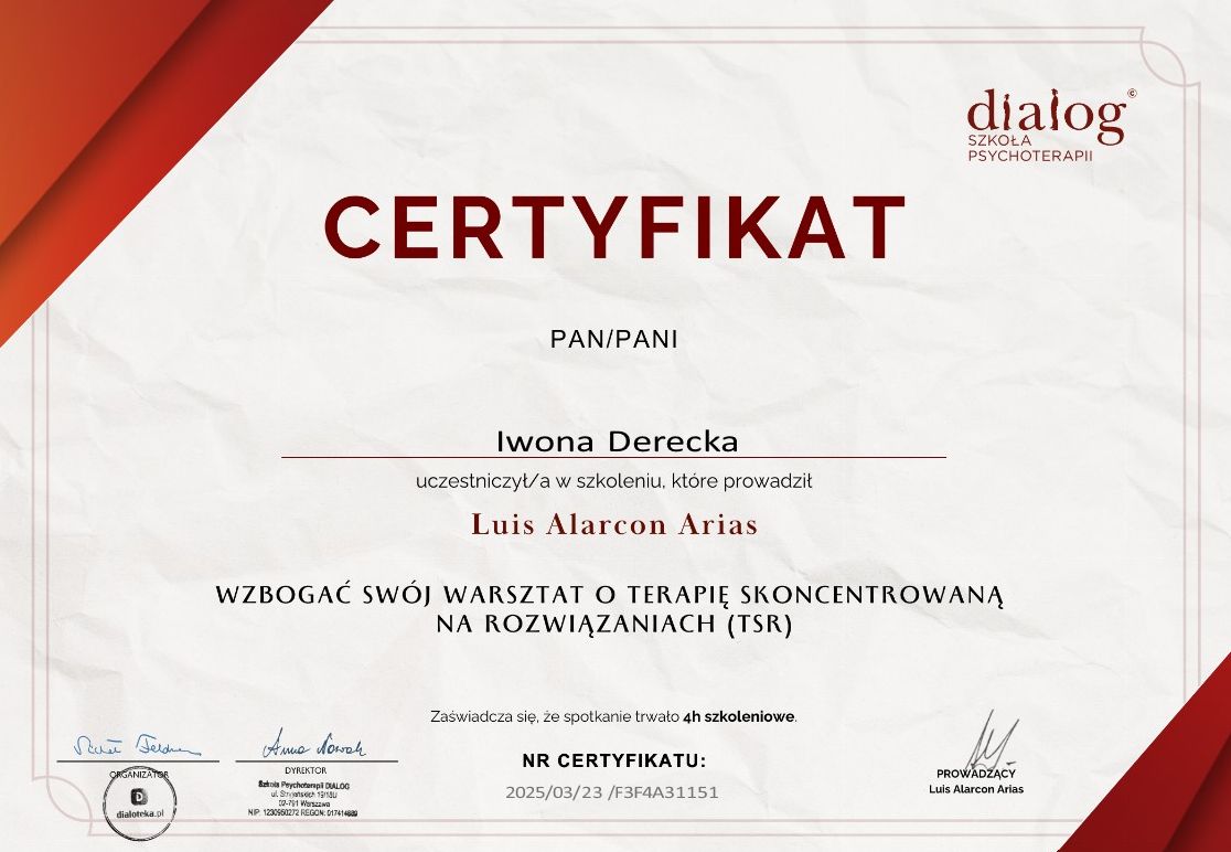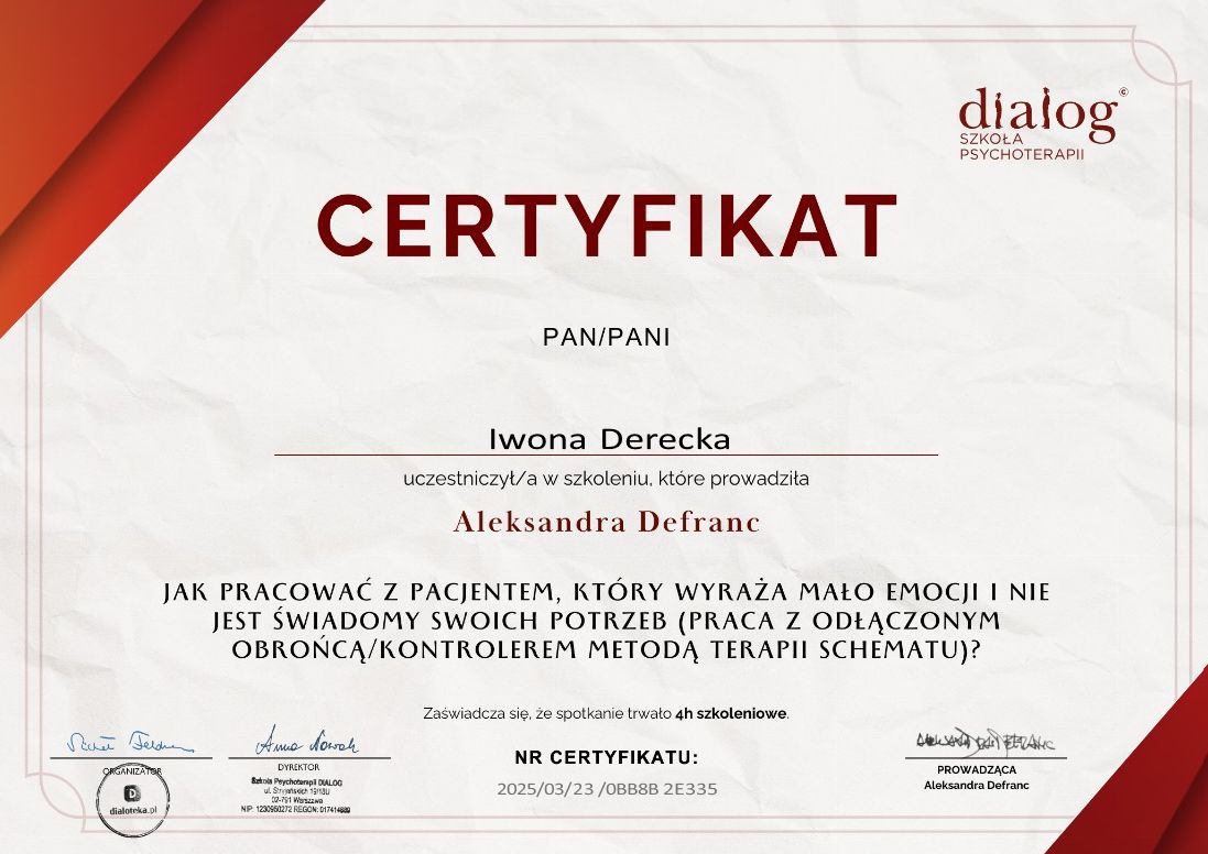 Jaki jest zakres porad oferowanych przez Iwona Derecka?Iwona Derecka to psycholog, psychoonkolog. Na podstawie swojego doświadczenia i wykształcenia Iwona Derecka oferuje usługi takie jak: Konsultacja psychologiczna, Konsultacja psychologiczna online, konsultacja psychoonkologiczna, terapia psychoonkologiczna, poradnictwo psychologiczne, interwencja kryzysowa, Wsparcie psychologiczne w kryzysie, konsultacja psychologiczna młodzieży, konsultacja psychologiczna dla seniorów, Konsultacja LGBTQ.