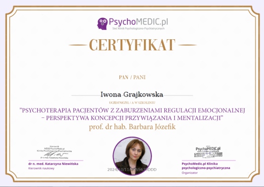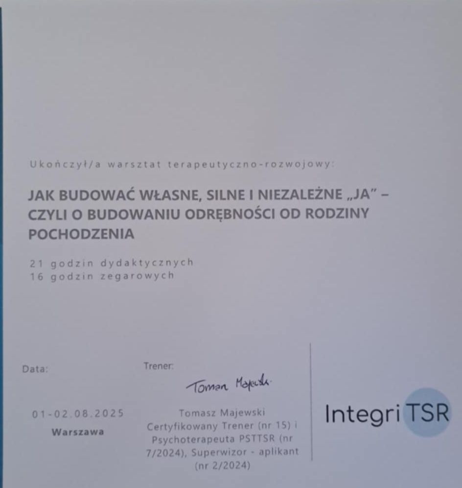 To była moja pierwsza wizyta u psychologa i jestem naprawdę pozytywnie zaskoczona. Od samego początku czułam się zaopiekowana, wysłuchana i zrozumiana. Pani Iwona stworzyła niezwykle ciepłą, bezpieczną atmosferę, w której łatwo było się otworzyć i mówić o swoich emocjach bez oceniania. Już po pierwszym spotkaniu poczułam ogromną ulgę i nadzieję, że to dobry krok w stronę lepszego samopoczucia. Bardzo dziękuję za empatię, spokój i profesjonalizm – z niecierpliwością czekam na kolejne spotkanie.