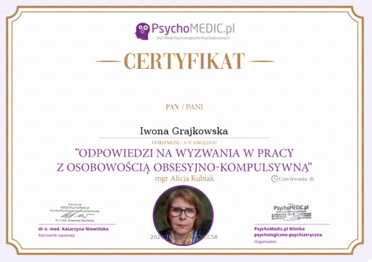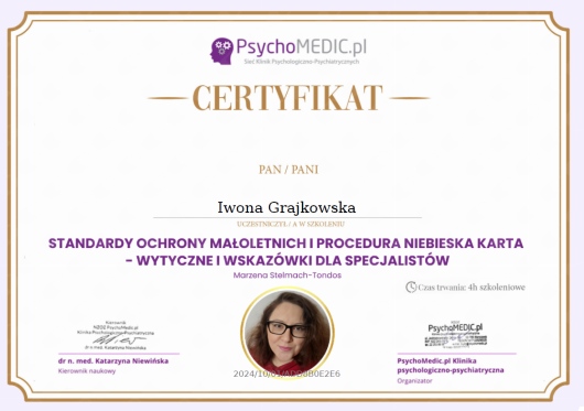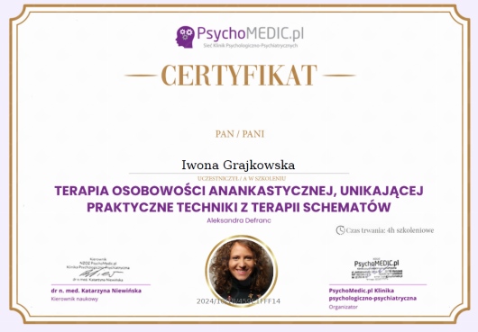 Czy Iwona Grajkowska przyjmuje online, bez konieczności pojawiania się w placówce?Tak, Iwona Grajkowska oferuje konsultacje online. Wybierz opcję „konsultacja online” przy umawianiu wizyty, a zobaczysz dostępne terminy.