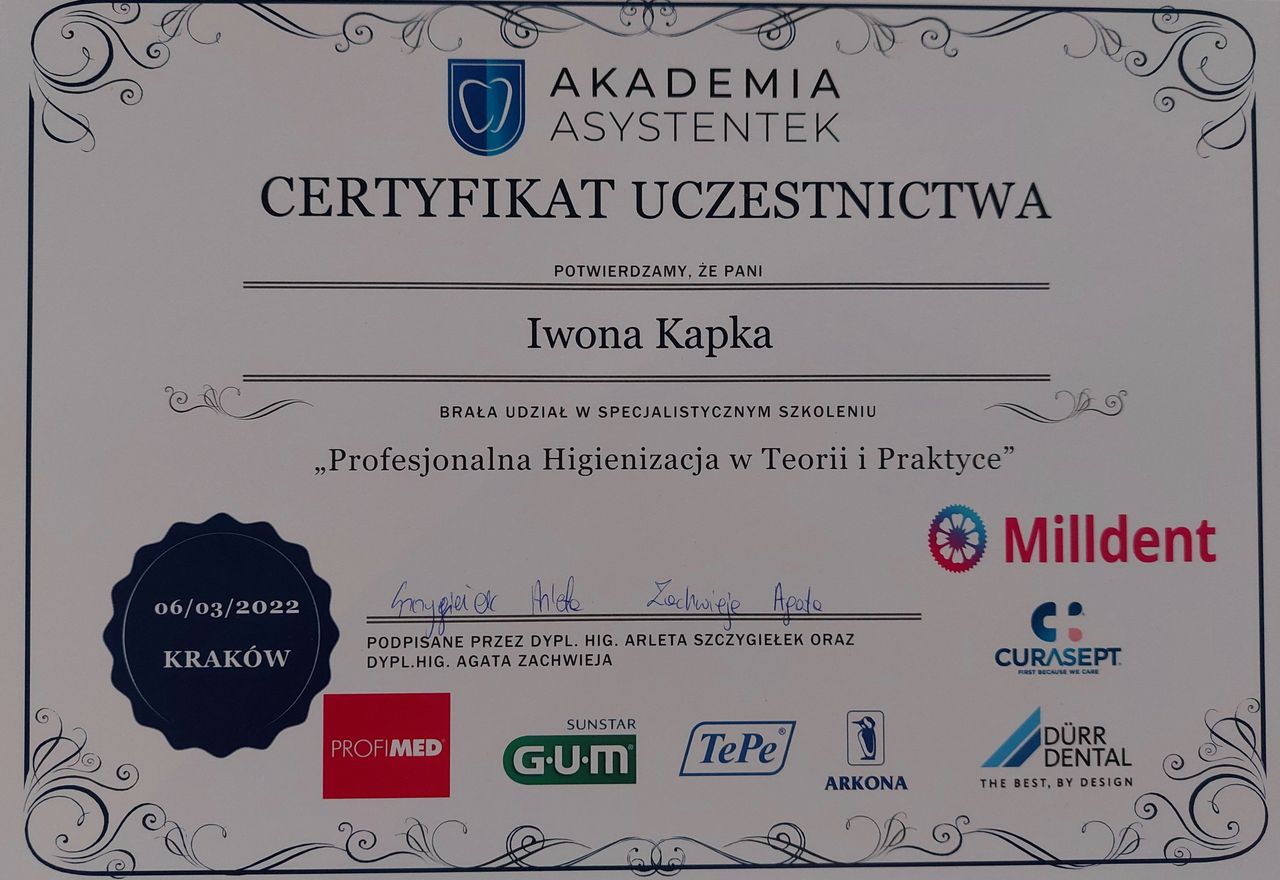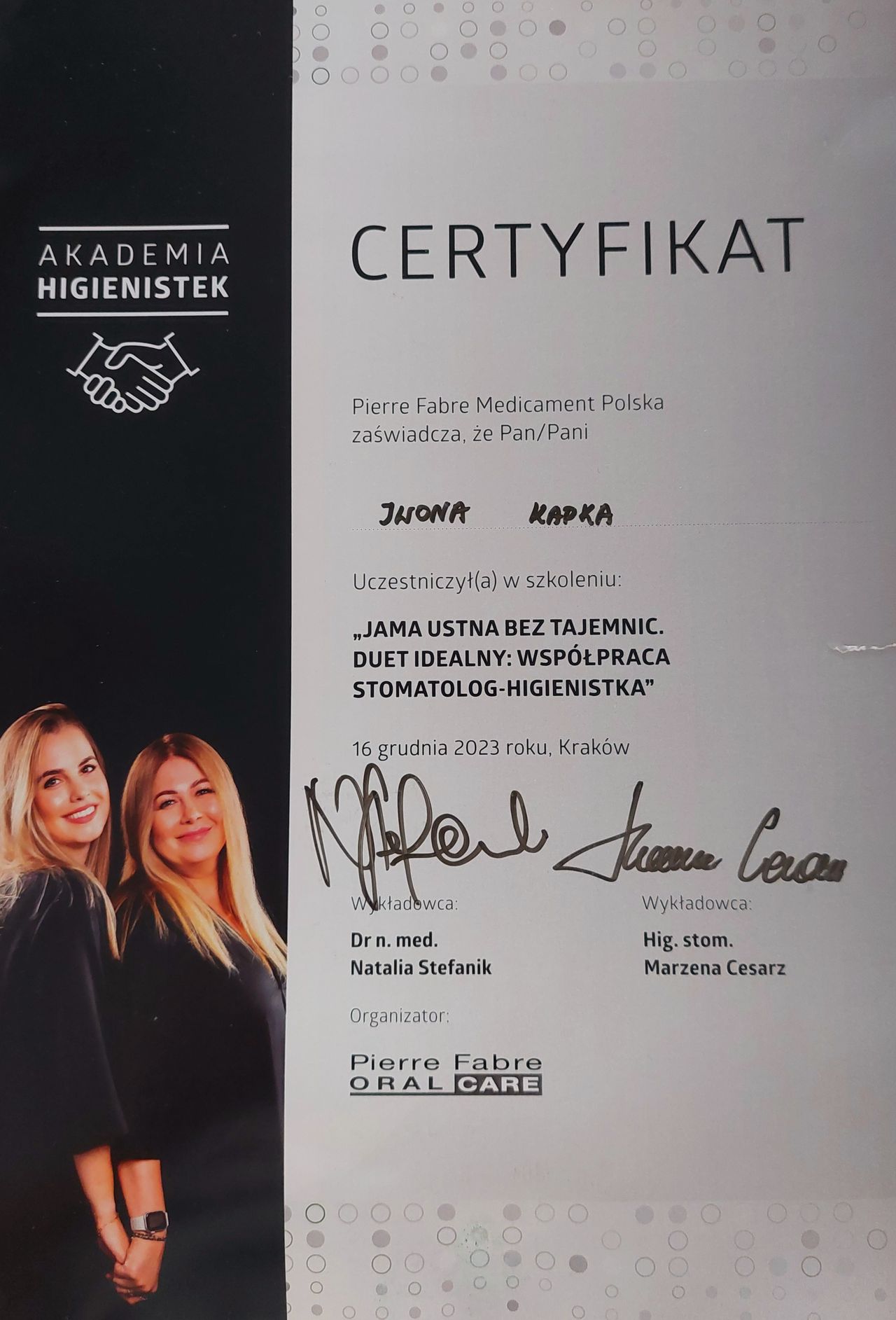 Zdobyła tytuł dyplomowanej higienistki stomatologicznej na Medycznej szkole policealnej w Nowym Targu oraz tytuł technika sterylizacji na Krakowskiej Szkole medycznej. Egzamin praktyczny i teoretyczny ukończyła z wynikiem 100 % . Od trzynastu lat jej kariera zawodowa jest związana ze stomatologią, a szczególnie z chirurgią stomatologiczną. Nieustannie poszerza swoją wiedzę i kompetencje poprzez udział w licznych kursach, szkoleniach, czy konferencjach. Największą satysfakcję daje jej samodzielna praca z pacjentem, do której podchodzi z pełnym zaangażowaniem i pasją. Preferuje nowoczesne metody higienizacji , wykorzystując między innymi protokół GBT opracowany przez firmę EMS. Wielką wagę przywiązuje do edukacji pacjentów w zakresie profilaktyki stomatologicznej. Kontakt z Pacjentami i udzielenie im fachowej pomocy daje jej największą satysfakcję z pracy. Stara się, by zabieg higienizacji był nie tylko koniecznością, ale tez miłym wspomnieniem. Dba o to, aby pacjent wychodząc z gabinetu, był zmotywowany do prawidłowej higieny i mógł cieszyć się pięknym i zdrowym uśmiechem. Swoją Prace wykonuje w powiększeniu lup.