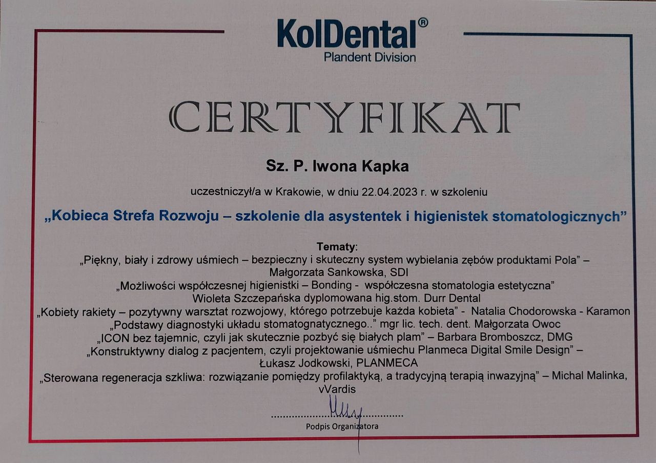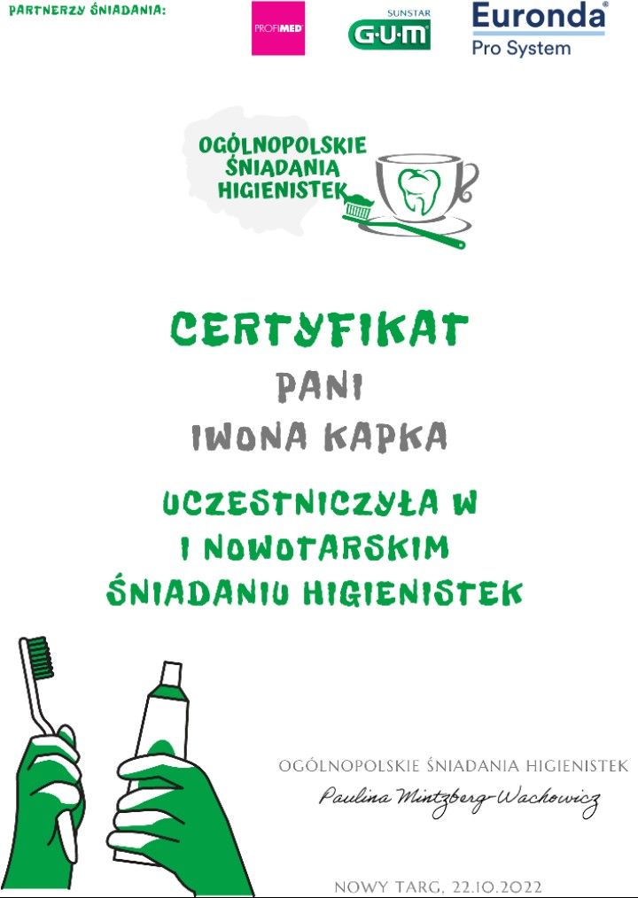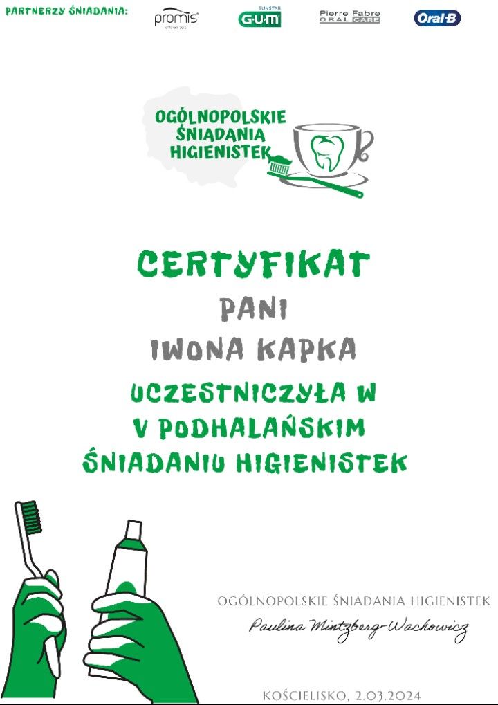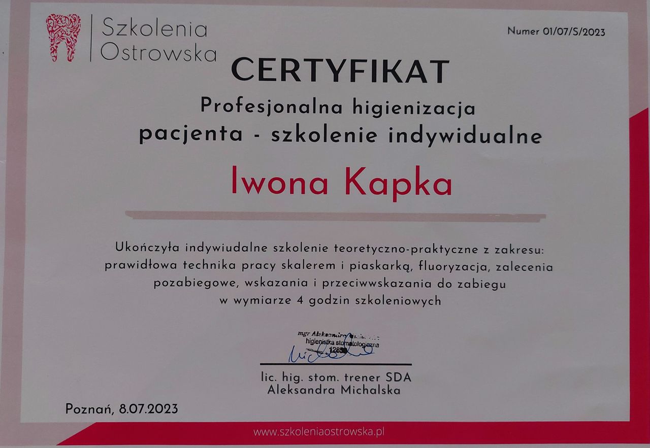Pani Iwona Kapka to higienistka , która wykonuje swoją pracę na najwyższym poziomie .Posiada ogromną wiedzę, ciągle podnosząc swoje kwalifikacje. Dba o pacjenta , sumienna i życzliwa. Jeśli ktoś jeszcze zastanawia się nad wyborem swojej higienistki to powinien umówić się do Iwonki.