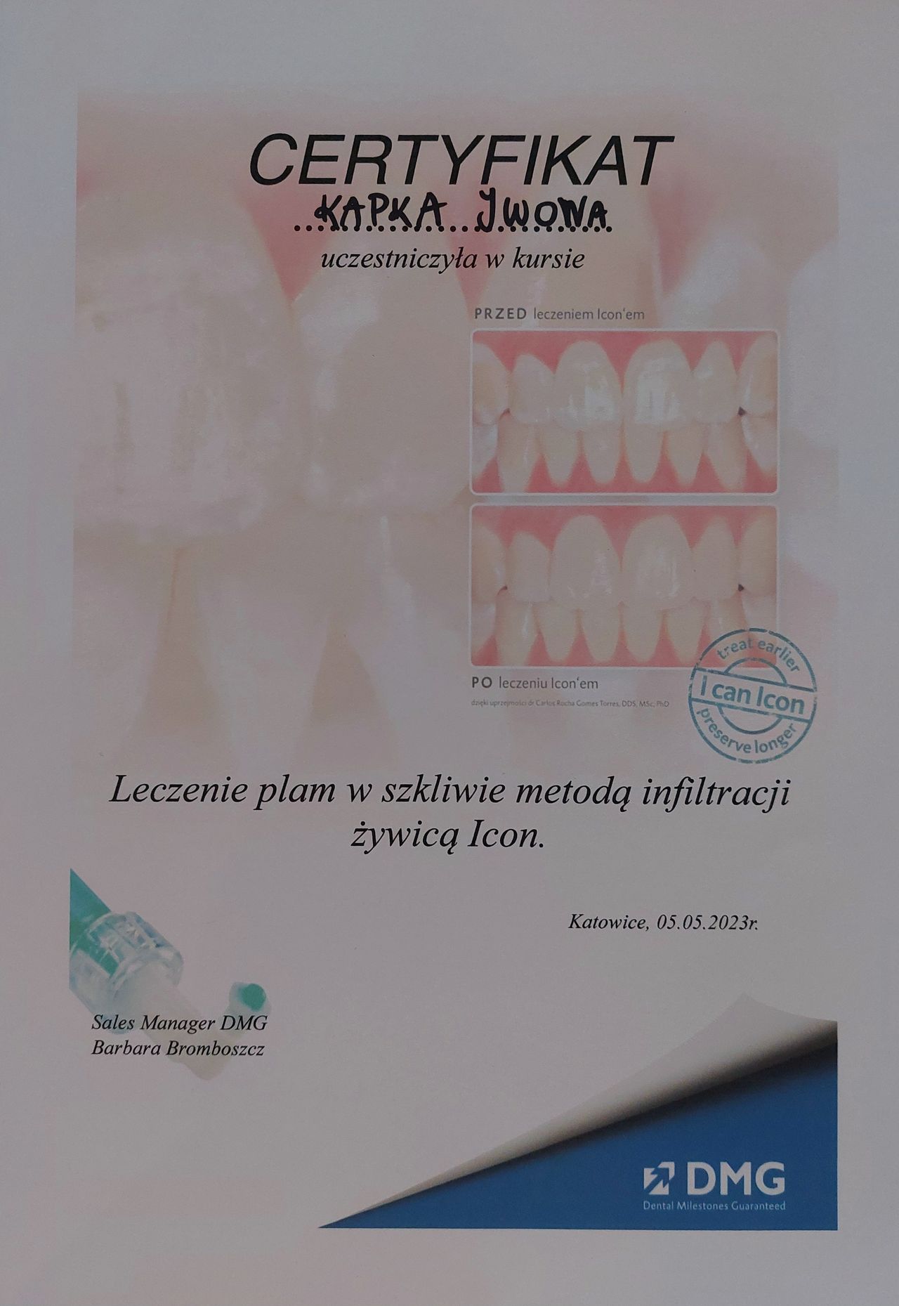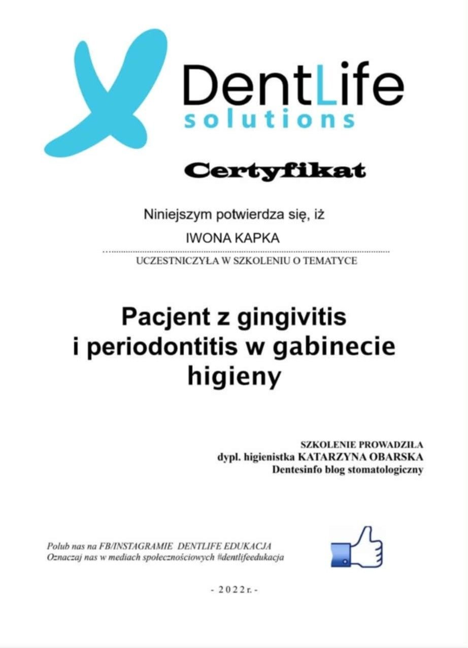 Jaki jest zakres porad oferowanych przez Iwona Kapka?Iwona Kapka to higienistka/higienista stomatologiczny. Na podstawie swojego doświadczenia i wykształcenia Iwona Kapka oferuje usługi takie jak: Guided Biofilm Therapy, higienizacja, Wybielanie zębów, ICON, fluoryzacja zębów.