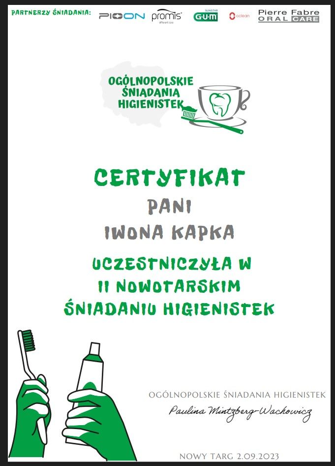 Do Pani Iwony trafiłam z polecenia, na co dzień przebywam w innej części Polski. Wybór okazał się trafny: pani higienistka od wejścia do gabinetu tworzy miłą atmosferę. Zabieg przebiegał sprawnie, bezboleśnie, a wychodząc z gabinetu otrzymałam jasne instrukcje jak w domowych warunkach dbać o zęby. Pani Iwona pokazała na gipsowym modelu w jaki sposób je czyścić, zwróciła moją uwagę na to, jak często nalezy wymieniać szczoteczkę. Niby to wiedziałam, ale co innego usłyszec to od specjalisty