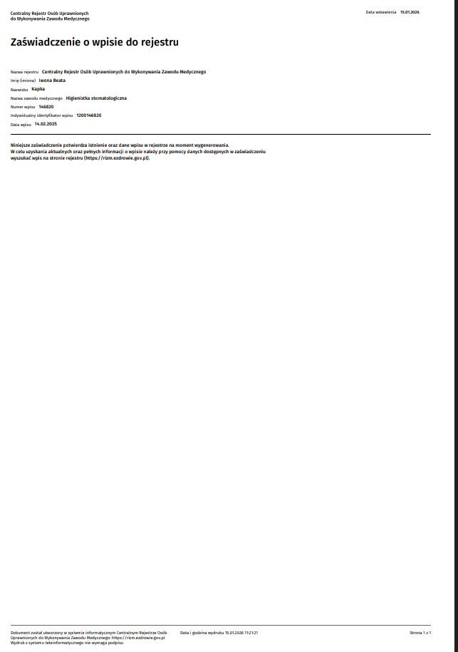 Pełen profesjonalizm i doświadczenie. Pani Iwona z dokładnością wytłumaczyła każdy etap w zabiegu higienizacji i wykonała go z delikatnością. Byłam bardzo zaopiekowana a po wizycie dostałam pełen instruktaż jak dbać o swoje ząbki w domu. Polecam z całego serca