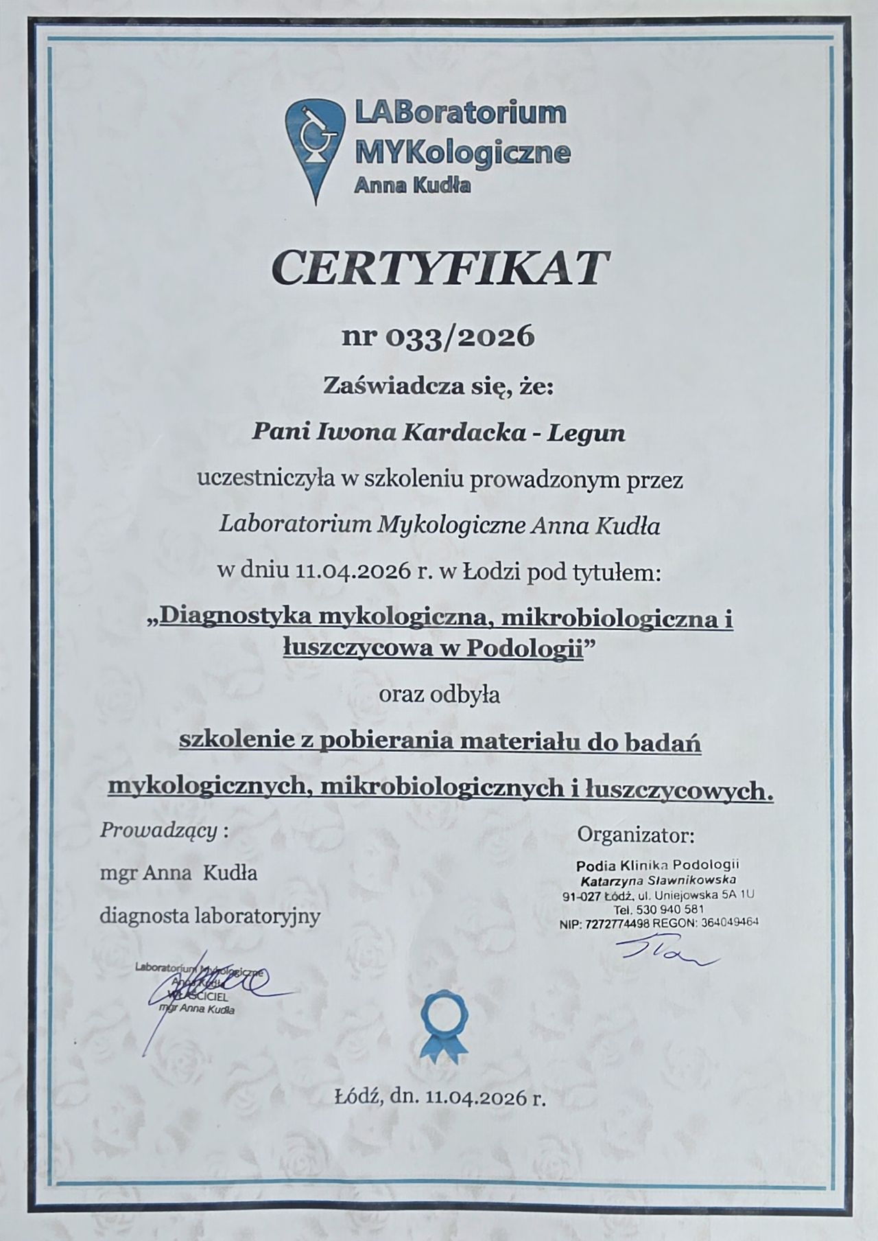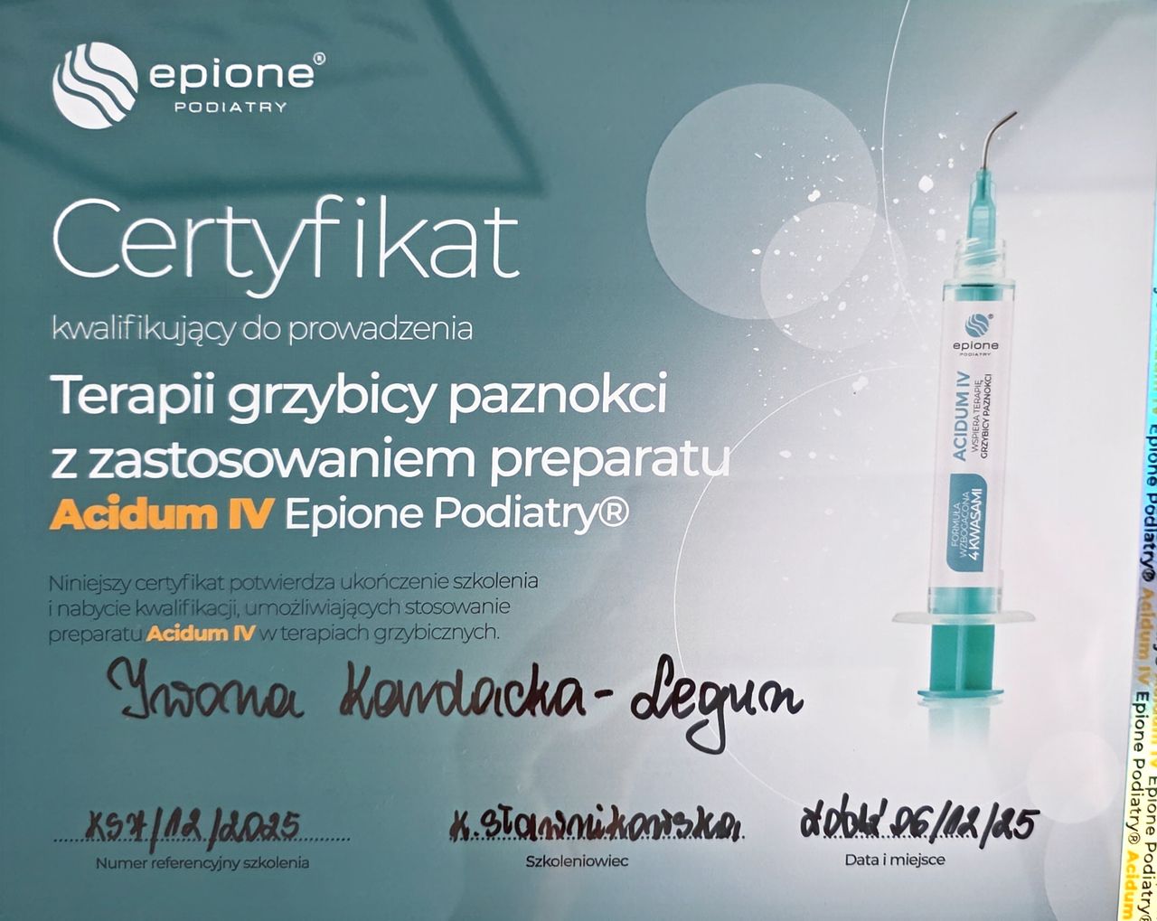 Swój dyplom zdobyłam już 14 lat temu, a przez ostatnie lata z pasją dbam o zdrowie stóp swoich pacjentów. Moja wiedza i umiejętności są poparte nie tylko wieloletnią praktyką, ale także solidnym wykształceniem – jestem również technikiem farmaceutycznym oraz technikiem sterylizacji. Dzięki temu mam kompleksowe podejście do higieny, profilaktyki i leczenia schorzeń stóp, łącząc precyzję z troską o bezpieczeństwo pacjentów.