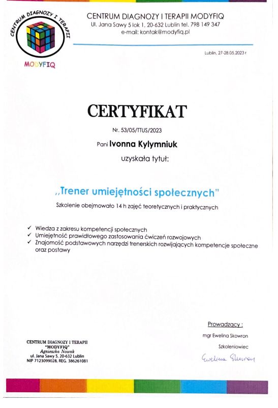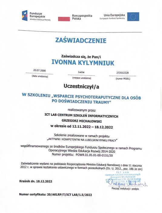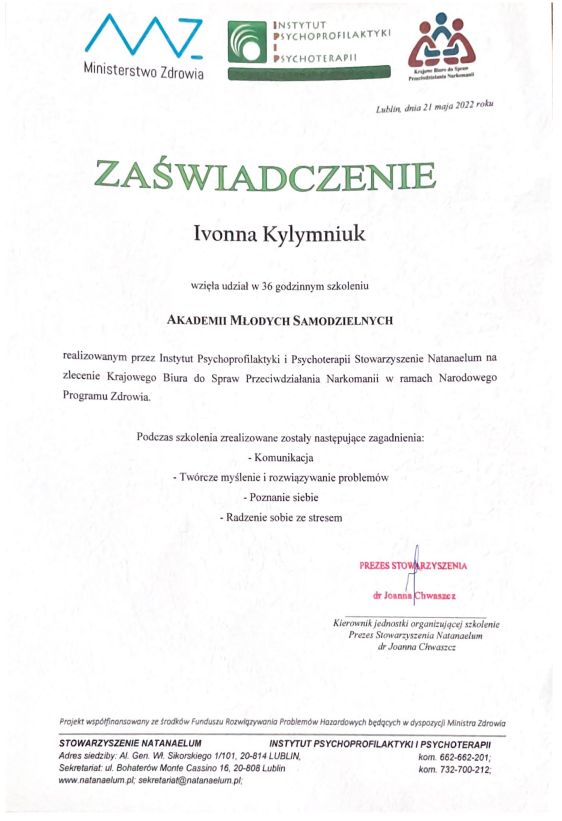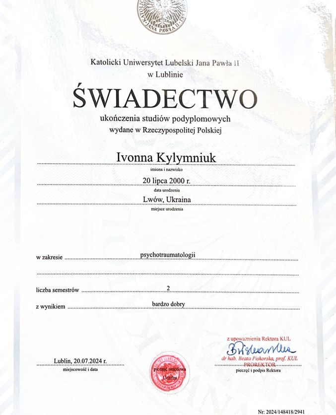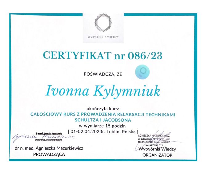 Jaki jest zakres porad oferowanych przez Iwona Kyłymniuk?Iwona Kyłymniuk to psycholog, psychotraumatolog. Na podstawie swojego doświadczenia i wykształcenia Iwona Kyłymniuk oferuje usługi takie jak: Konsultacja psychologiczna, relaksacja, Konsultacja psychologiczna online, konsultacja psychologiczna online - weekend, święta, interwencja kryzysowa, poradnictwo psychologiczne, konsultacja psychotraumatologiczna, konsultacja psychologiczna młodzieży, psychoterapia traumy, Konsultacja psychotraumatologiczna on-line.