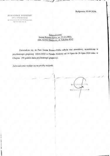 Ukończyłam psychologię o specjalności klinicznej na Uniwersytecie SWPS oraz jestem w trakcie 5-letniego podyplomowego kursu z psychoterapii w Polskim Instytucie Ericksonowskim, atestowanego przez Sekcję Naukową Psychoterapii Polskiego Towarzystwa Psychiatrycznego. Jestem też pedagogiem - wiele lat pracowałam z młodzieżą jako nauczyciel i wychowawca. Ponadto spędziłam 8 lat na emigracji w Szkocji co również w bardzo istotny sposób wzbogaciło moje doświadczenie życiowe i zawodowe. Obecnie pracuję w Wielkopolskim Centrum Zdrowia Psychicznego w Poznaniu.