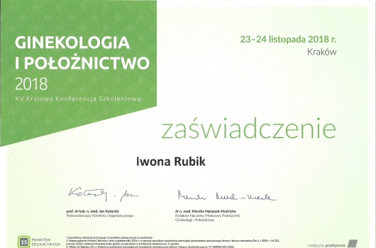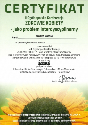 W 1995 uzyskałam I stopień specjalizacji z ginekologii i położnictwa, a następnie w 1999 II stopień specjalizacji w w/w dziedzinie.