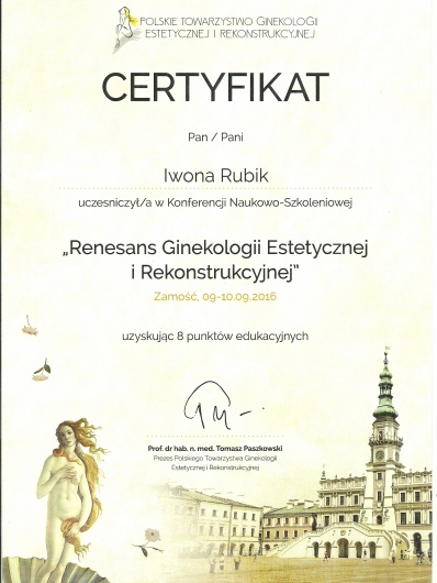 Moją pasją jest ginekologia plastyczna i estetyczna. Aby zdobywać wiedzę i doświadczenie w tej dziedzinie regularnie uczestniczę w szkoleniach, kongresach krajowych i zagranicznych. Jestem członkiem Polskiego Towarzystwa Ginekologii Plastycznej, które powstało w 2011 r. PTGP ustala standardy i wytyczne postępowania operacyjnego z zakresu ginekologii plastycznej i rekonstrukcyjnej, współpracuje z ośrodkami medycznymi w kraju i zagranicą.