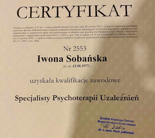 Certyfikowany specjalista psychoterapii uzależnień nr. 2553.