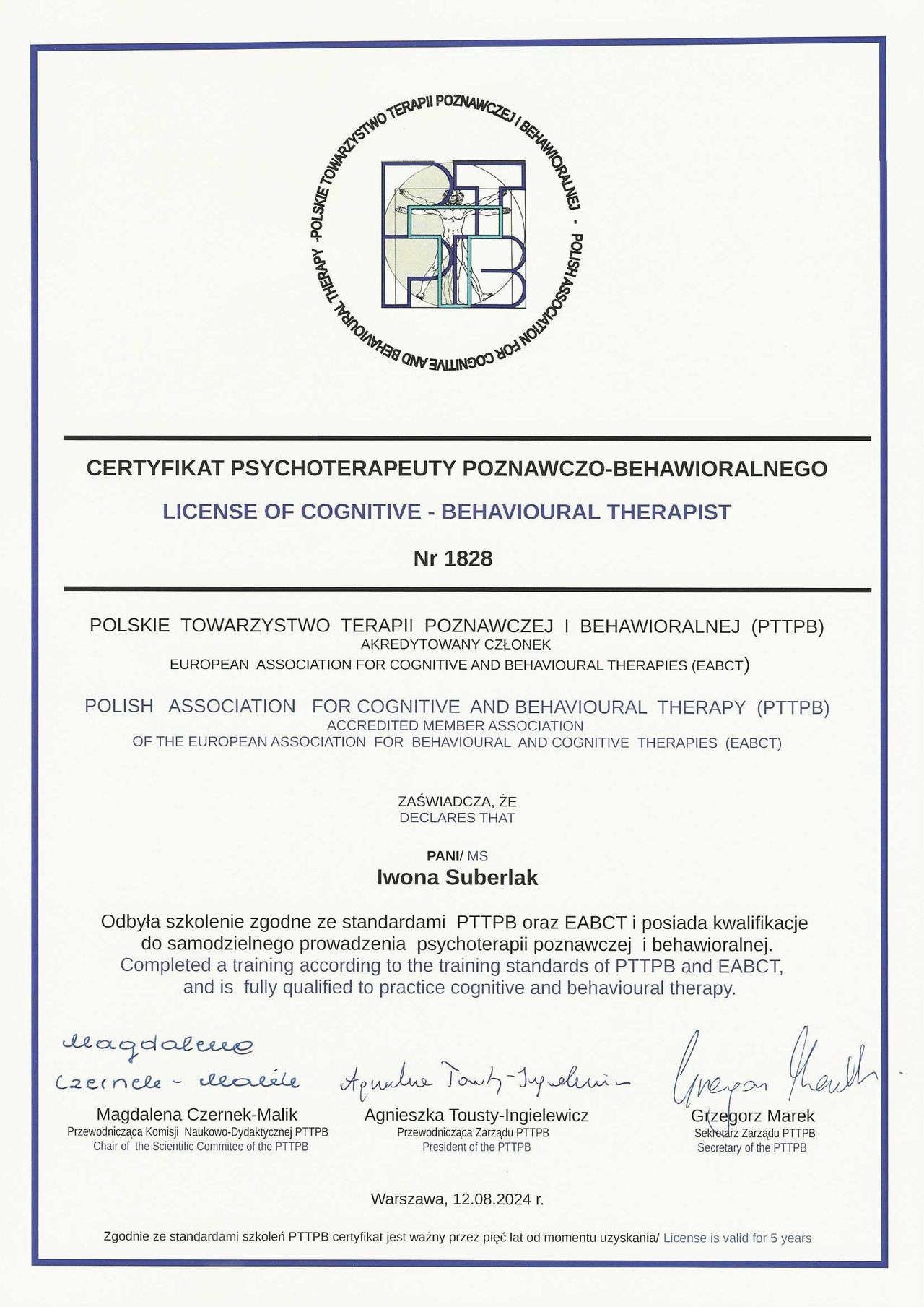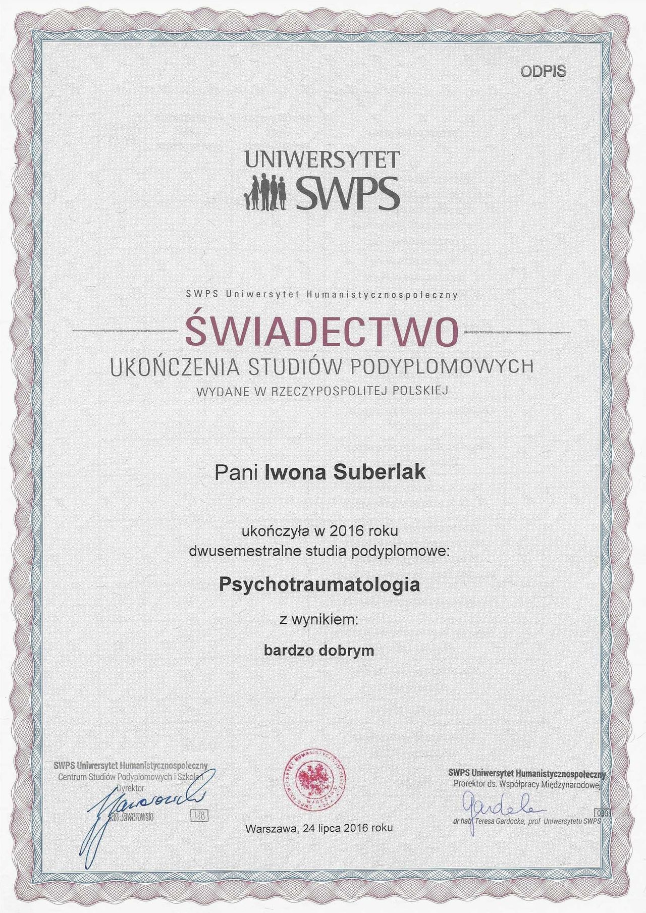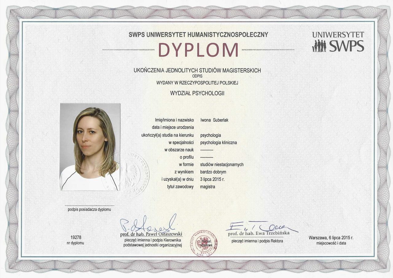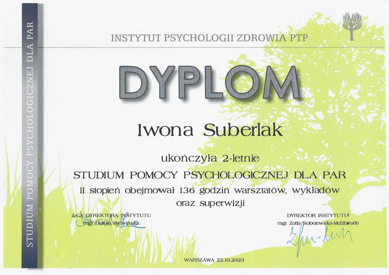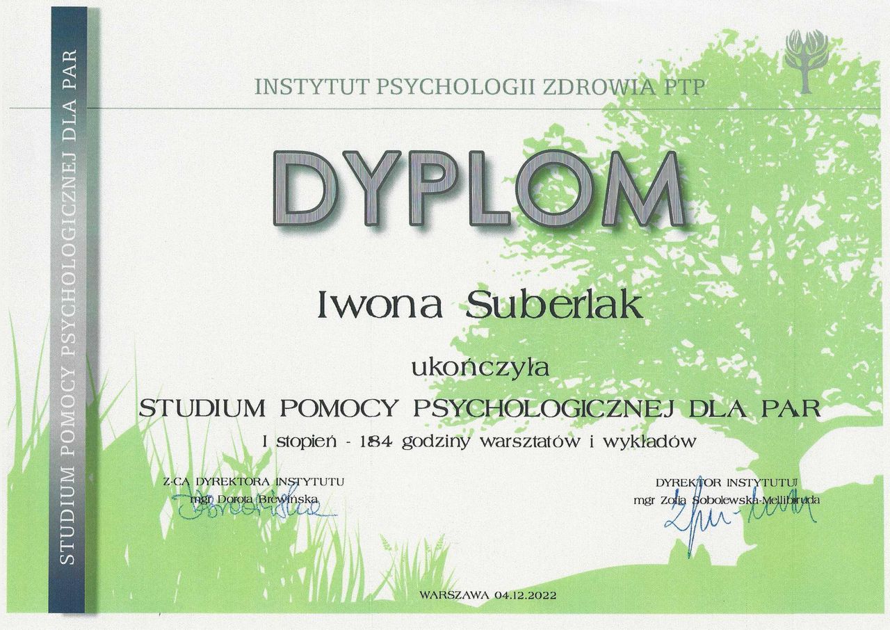 Jestem absolwentką studiów psychologicznych o specjalności Psychologia Kliniczna, studiów podyplomowych w zakresie Psychotraumatologii na Uniwersytecie SWPS w Warszawie, certyfikowanym psychoterapeutą poznawczo-behawioralnym (Certyfikat PTTPB nr 1828). Ukończyłam również Studium Pomocy Psychologicznej dla Par (I i II stopień) w Instytucie Psychologii Zdrowia w Warszawie. Systematycznie podnoszę swoje kwalifikacje i umiejętności terapeutyczne uczestnicząc w warsztatach i szkoleniach prowadzonych przez polskich i zagranicznych wykładowców.