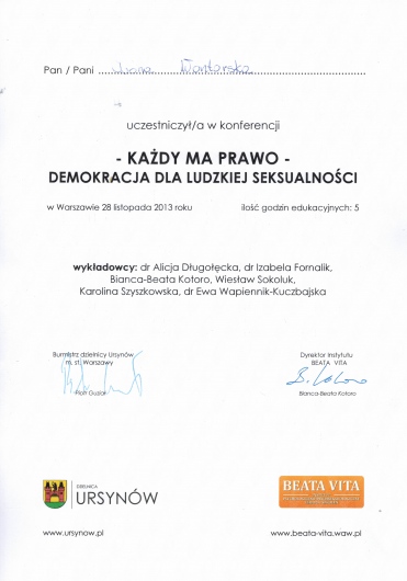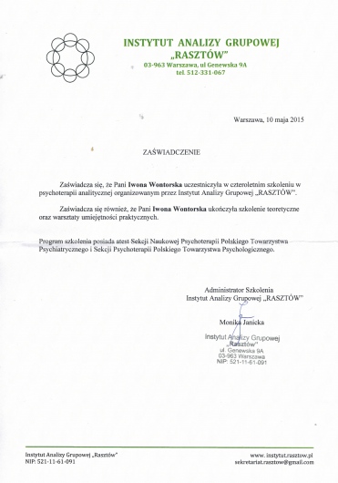 Ukończenie szkolenia w Instytucie Analizy Grupowej Rasztów. Szkolenie jest rekomendowane przez Polskie Towarzystwo Psychologiczne oraz Polskie Towarzystwo Psychiatryczne.