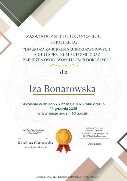 Jestem psycholożką w trakcie szkolenia psychoterapeutycznego w nurcie CBT. Współpracuję z Fundacją Ponad Schematami, gdzie zajmuję się diagnozą i wsparciem dorosłych osób z ADHD i Autyzmem.