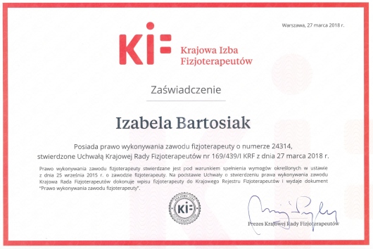 Jestem absolwentką Warszawskiego Uniwersytetu Medycznego a także Still Academy of Osteopathy. Posiadam doświadczenie pracy w zawodzie ponad 18 lat. Prowadzę terapię pacjentów po urazach, po zabiegach operacyjnych, z dolegliwościami bólowymi, dzieci z wadami postawy. Stale poszerzam swoją wiedzę biorąc udział w licznych kursach i szkoleniach podyplomowych. Jestem dyplomowaną osteopatką. Ukończone szkolenia: Terapia Manualna Szkoła Niemiecka NDT Bobath dla dzieci NDT Bobath dla dorosłych Anatomy Trains Neurodynamika Kliniczna Terapia manualna wg Mulligana PNF podstawowy, rozwijający, kliniczny w ortopedii PNF w skoliozach Kinesiotaping