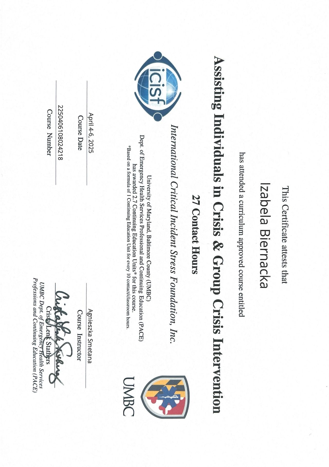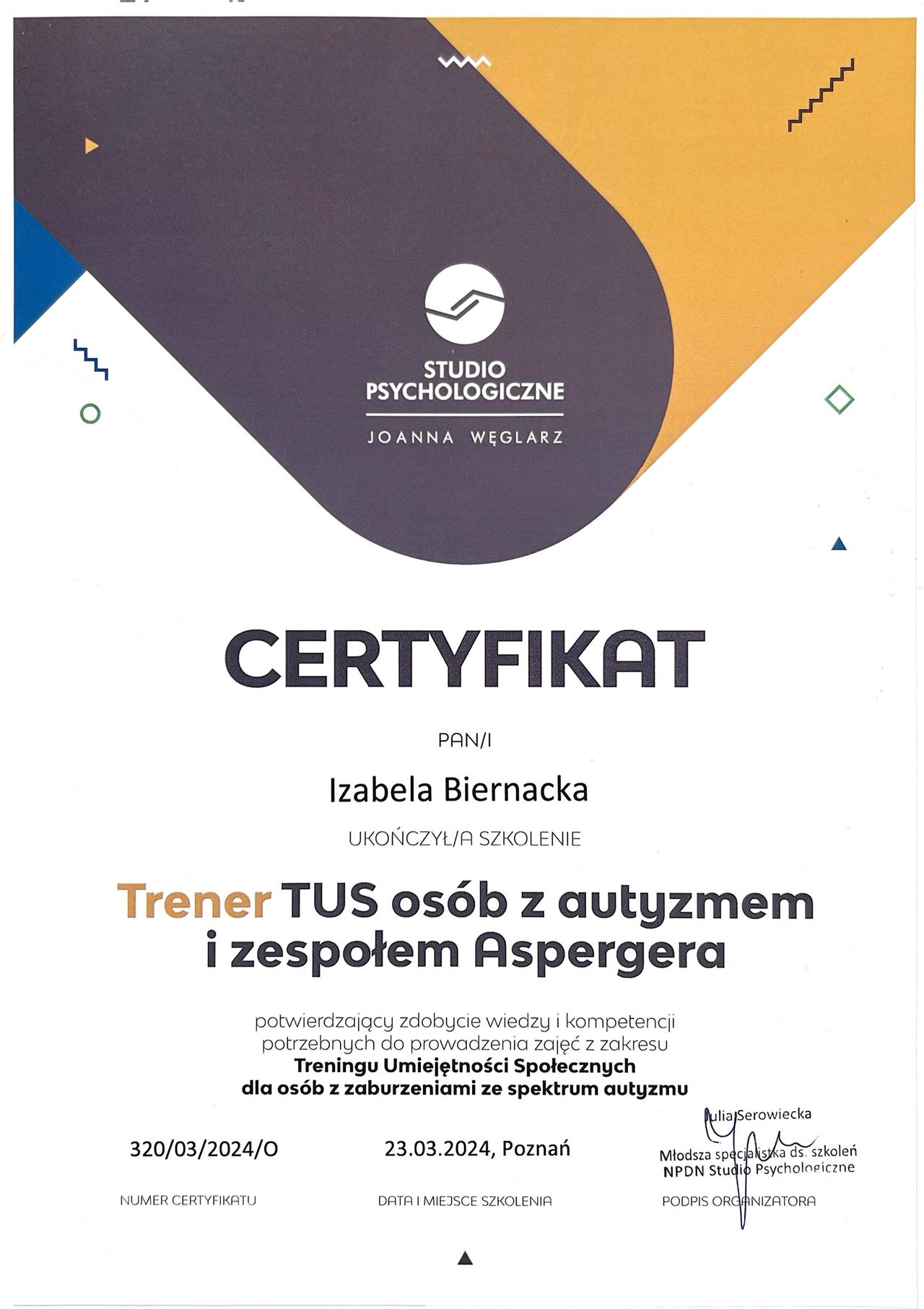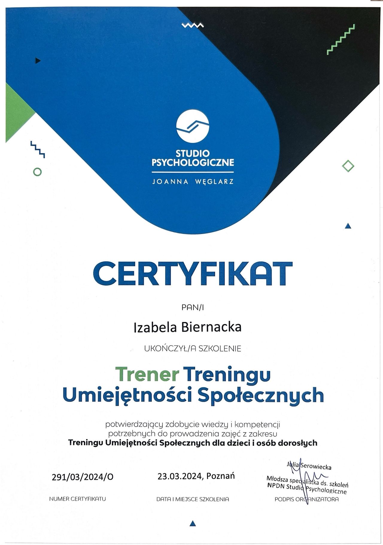 Stale poszerzam swoje kompetencje – ukończyłam m.in. szkolenie z Treningu Umiejętności Społecznych (TUS) oraz studia podyplomowe z zakresu Interwencji Kryzysowej na Uniwersytecie SWPS we Wrocławiu.