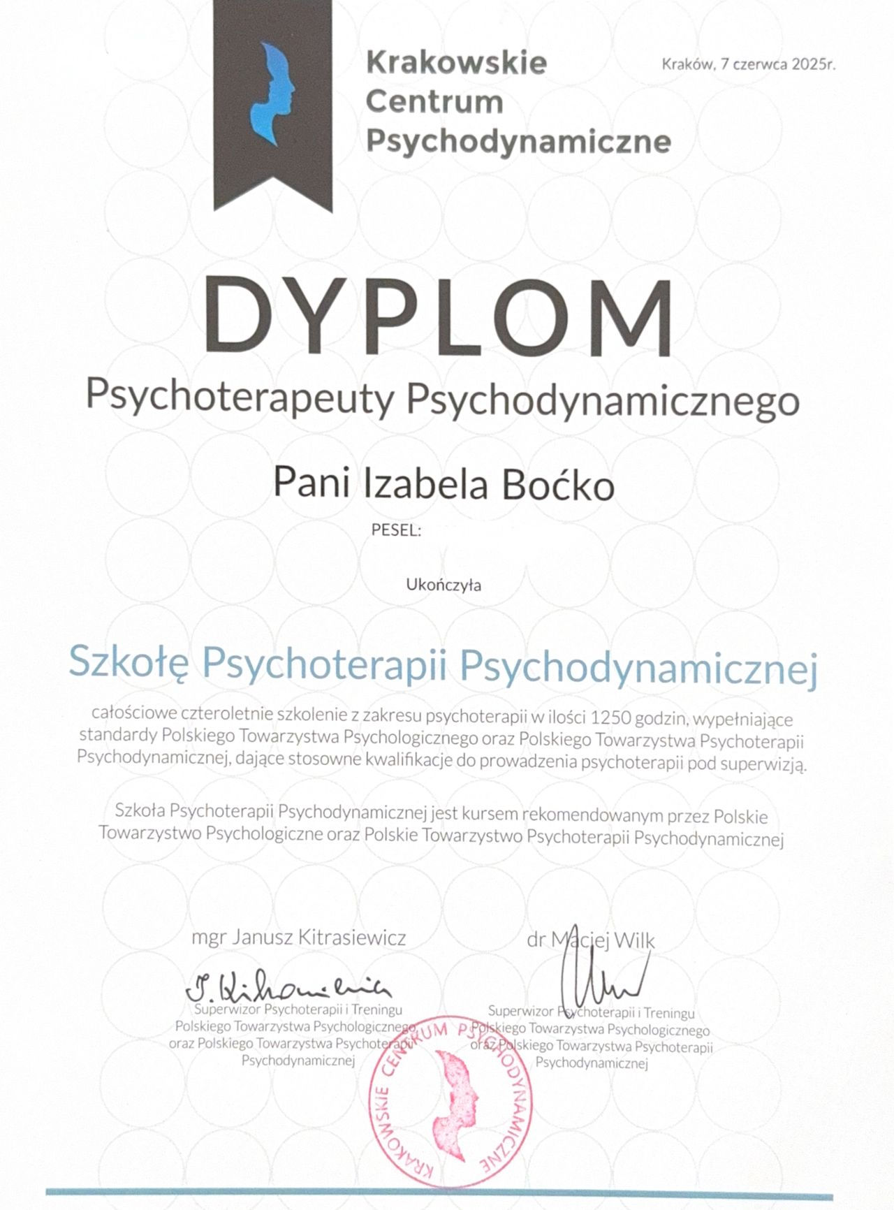 przez Polskie Towarzystwo Psychologiczne (PTP) oraz Polskie Towarzystwo Psychoterapii Psychodynamicznej (PTPPd). Prowadzę psychoterapię indywidualną osób dorosłych w nurcie psychodynamicznym.