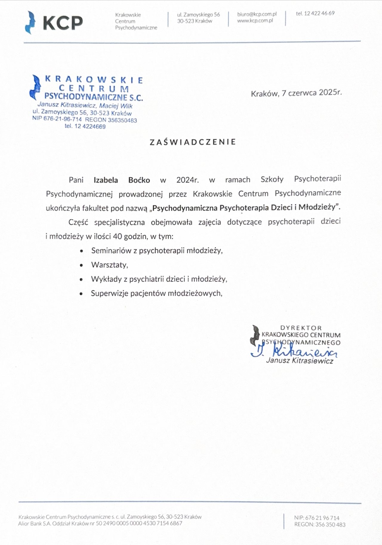 •Jestem psychoterapeutką. Ukończyłam 4-letnie szkolenie psychoterapeutyczne w Krakowskim Centrum Psychodynamicznym (KCP), rekomendowane