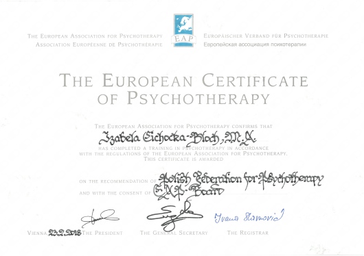 Posiadam certyfikat European Certyficate of Psychoterapy (EAP). Ukończyłam studia psychologiczne na Uniwersytecie Łódzkim oraz Studium Psychoterapii Integratywnej przy PIPI w Krakowie, 3 – letnią Szkołę Nowych Ustawień Rodzin wg Berta Hellingera oraz 3- letni kurs Somatic Experiencing (metoda pracy z traumą), 1 i 3 fazę Kursu Brainspotting - najnowsza metoda pracy z traumą. Swoją praktykę poddaję superwizji.