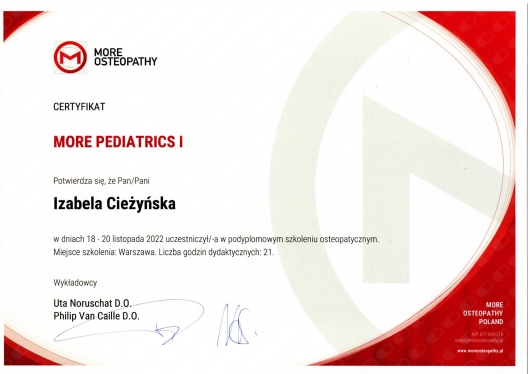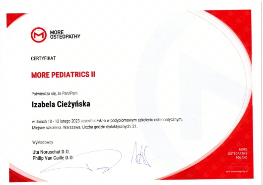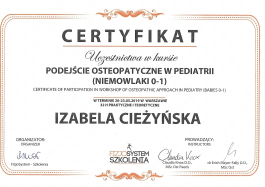 Jaki jest zakres porad oferowanych przez Izabela Cieżyńska?Izabela Cieżyńska to fizjoterapeuta, osteopata. Na podstawie swojego doświadczenia i wykształcenia Izabela Cieżyńska oferuje usługi takie jak: konsultacja fizjoterapeutyczna, fizjoterapia, osteopatia, terapia wisceralna, osteopatia dziecięca, osteopatia pediatryczna, fizjoterapia niemowląt, konsultacja osteopatyczna kobiet w ciąży i okresie okołoporodowym, Terapia czaszkowo-krzyżowa, Osteopatia kobiet w ciąży.