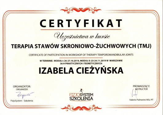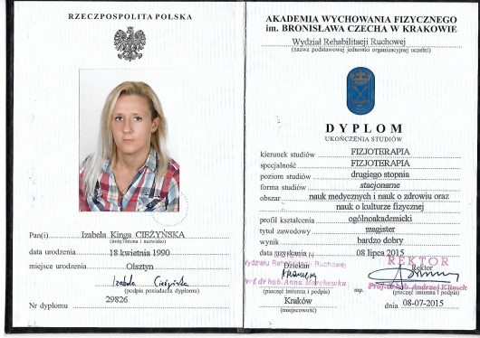 Skończyłam studia z fizjoterapii oraz czteroletnie studia osteopatii. Ciągle poszerzam swoją wiedzę, ucząc się u najlepszych zagranicznych specjalistów ze Szwajcarii, Belgii i Stanów Zjednoczonych. Jestem również w trakcie studiów z medycyny funkcjonalnej na Functional Medicine Univeristy w USA.
