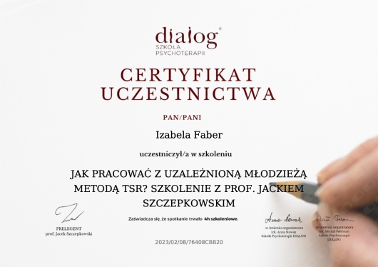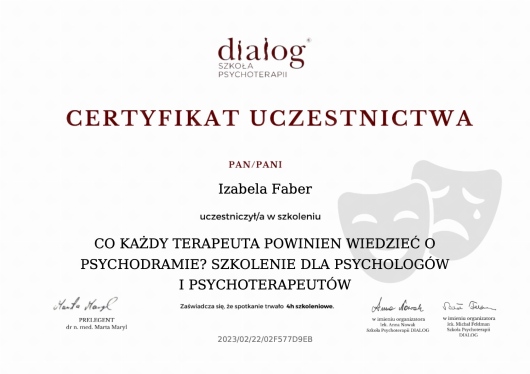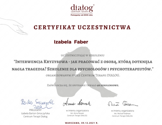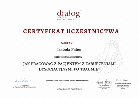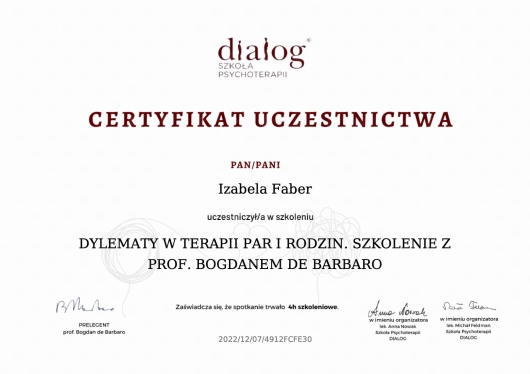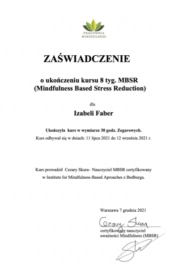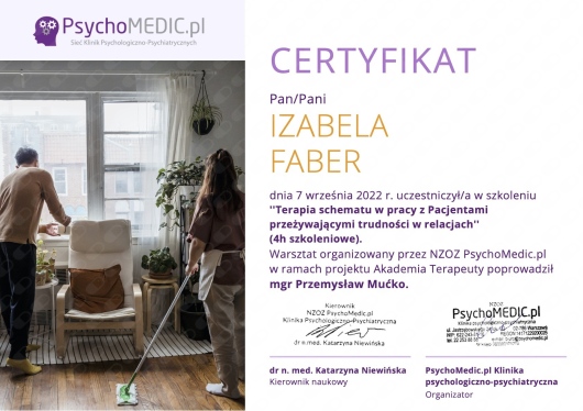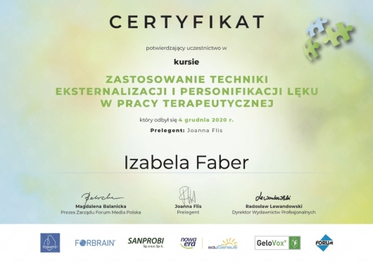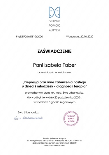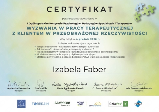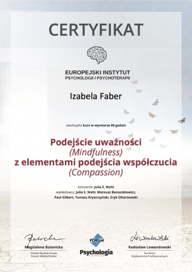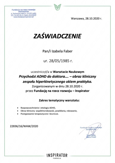 Bardzo polecam mgr Izabelę w pracy nad adhd. Pani Faber slucha i wyciąga wnioski, przy tym nie pobłaża, ale też mówi rzeczowo i z empatią.