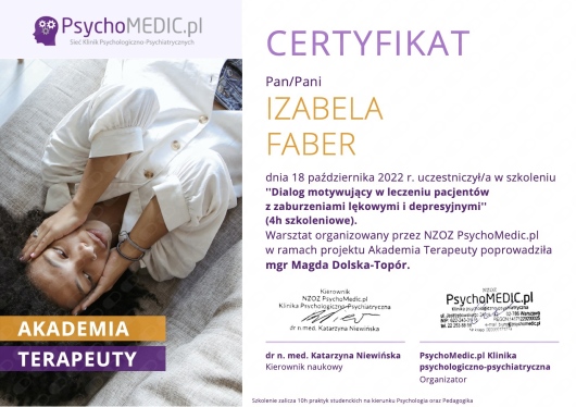 Pani Izabela zapewnia komfortową przestrzeń do wypowiadania się, uważnie słucha i dzieli się spostrzeżeniami pomagając samemu lepiej ułożyć sobie w głowie problematyczne sprawy. Zawsze jest przygotowana i pamięta kontekst problemów z poprzednich wizyt.