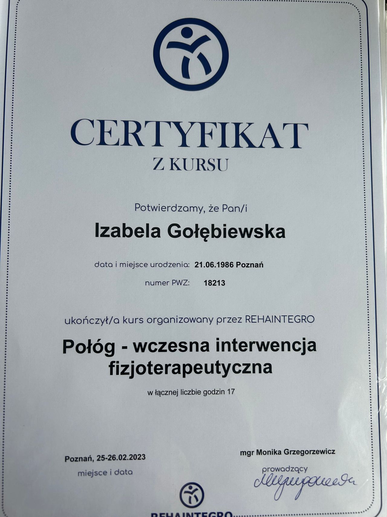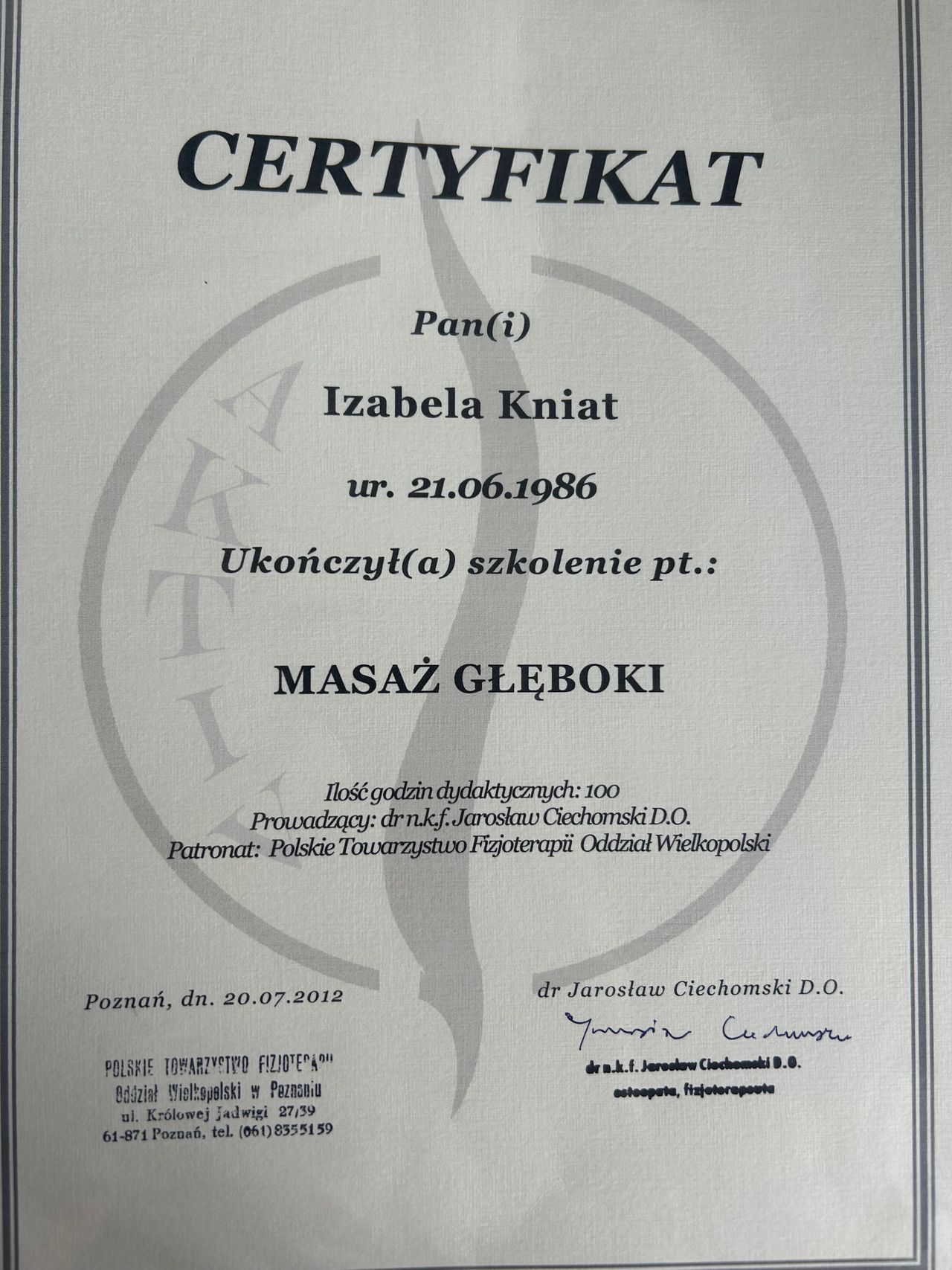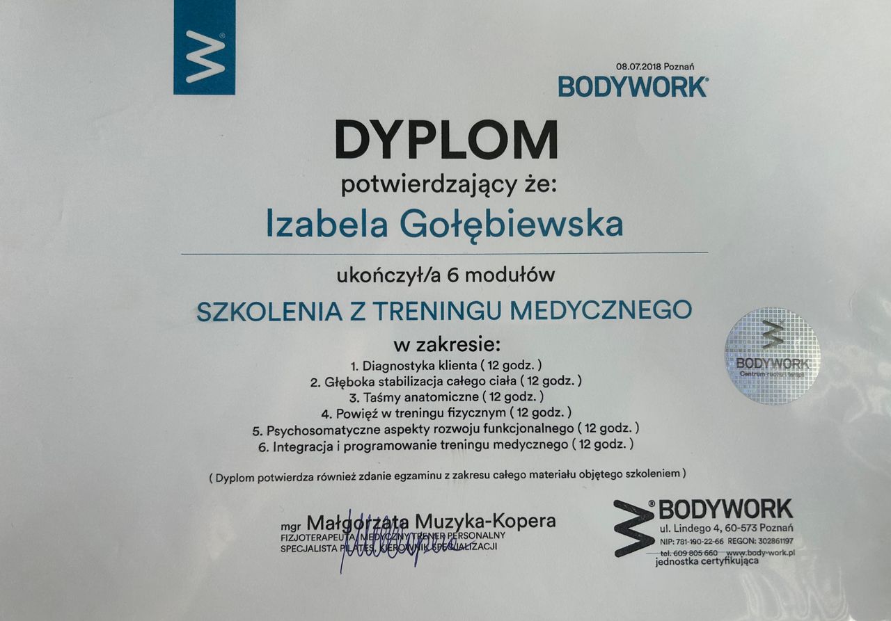 Jestem absolwentką Akademii Wychowania Fizycznego w Poznaniu, gdzie obroniłam tytuł magistra fizjoterapii.