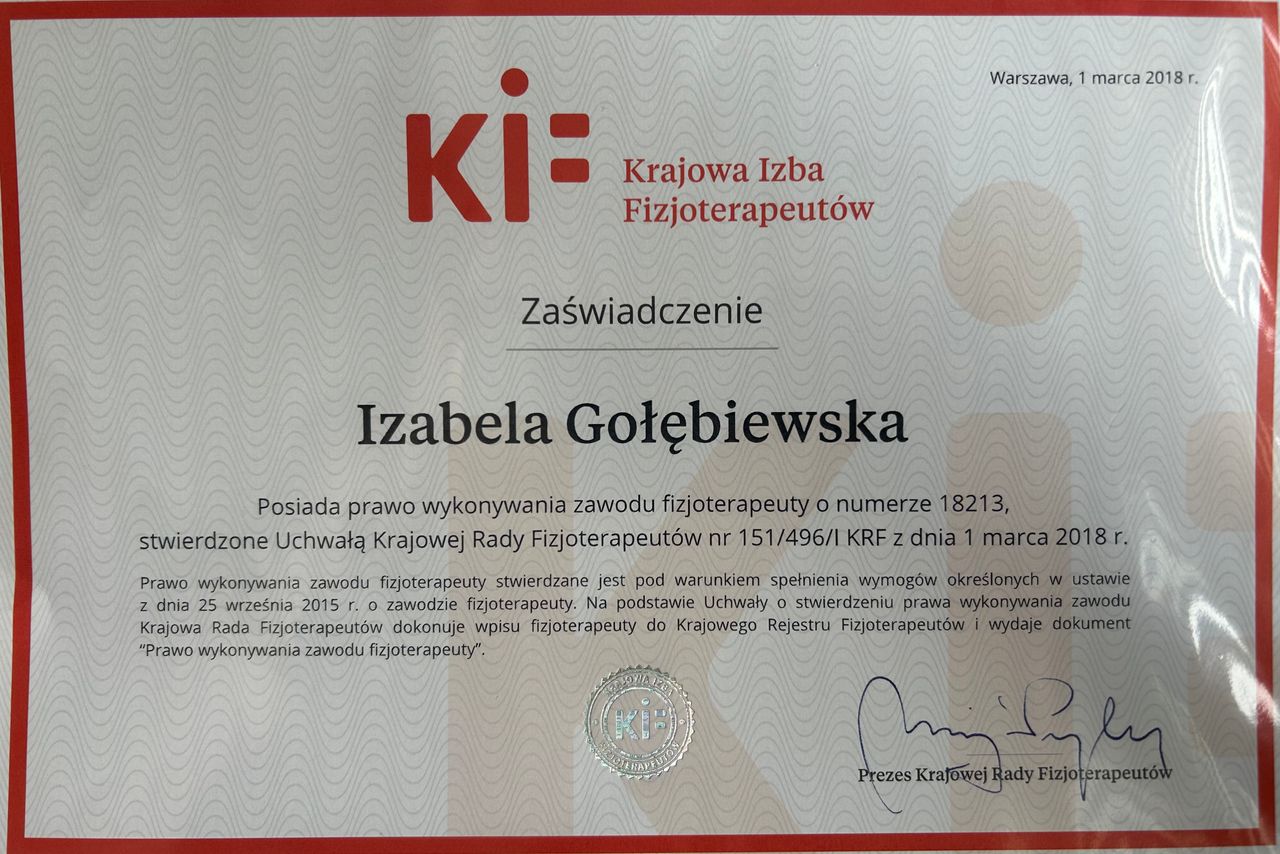 Bardzo polecam Panią Izabele! W gabinecie panuje rewelacyjna atmosfera. W trakcie spotkania zostałam dokładnie zbadana oraz zostały przekazane mi wszystkie potrzebne informacje i zalecenia. Pani Izabela posiada naprawdę ogromną widzę w zakresie fizjoterapii.