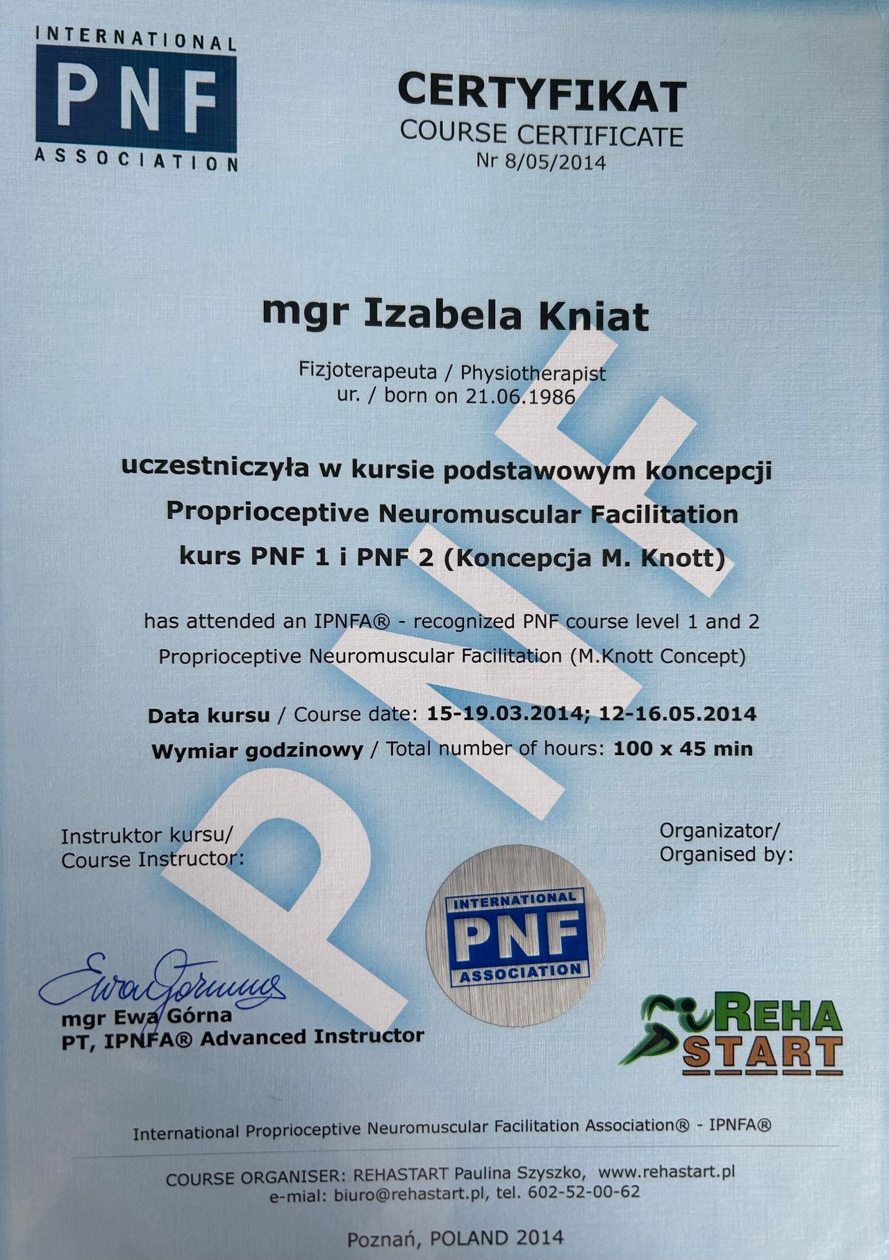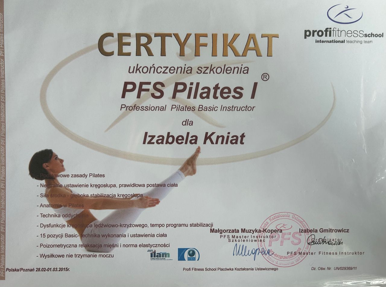 Ukończone kursy: "Terapia tkanek miękkich - rozluźnianie mięśniowo - powięziowe" J.Ciechomski; "Masaż głęboki" J.Ciechomski; "PNF - poziom podstawowy " E.Górna; "Instruktor Pilates - poziom podstawowy" M.Muzyka-Kopera; "Trener medyczny - 6 modułów" BodyWork; "Połóg wczesna interwencja medyczna w fizjoterapii"M.Grzegorzewicz; "Kompleksowa terapia blizn" P.Pietrowski; "Kompleksowa terapia w uroginekologii moduł I i II" A.Dziadosz, A.Piotrowska.