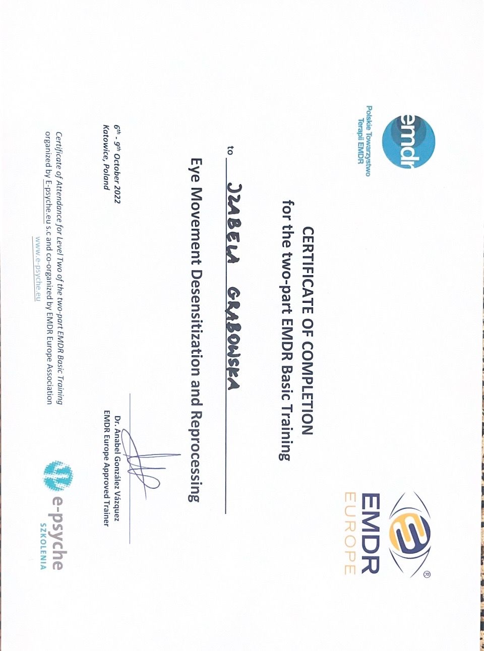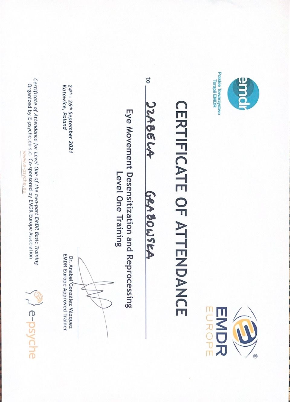 Ukończyłam liczne szkolenia, w tym: specjalistyczne psychoterapii psychoz (atestowane przez Polskie Towarzystwo Psychiatryczne), diagnozy zaburzeń dysocjacyjnych z zastosowaniem TADS-I, warsztaty z zaburzeń konwersyjnych (Anabel Gonzalez), I i II poziom szkolenia certyfikacyjnego EMDR. Obecnie w trakcie programu certyfikacyjnego diagnosty Europejskiego nTowarzystwa Traumy i Dysocjacji (ESTD).
