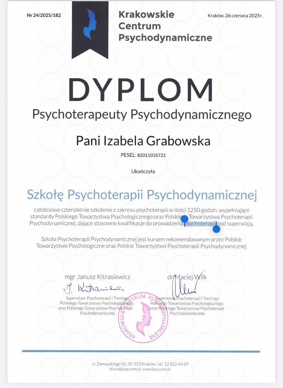 Swoją pracę regularnie poddaję superwizji prowadzonej przez certyfikowanych superwizorów Polskiego Towarzystwa Psychologicznego oraz Polskiego Towarzystwa Psychiatrycznego.