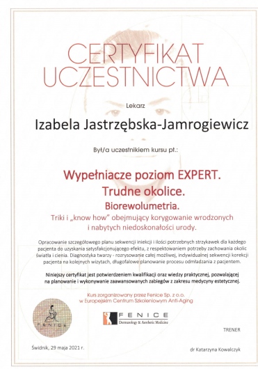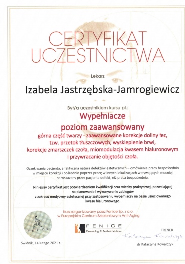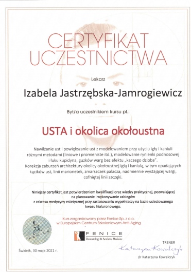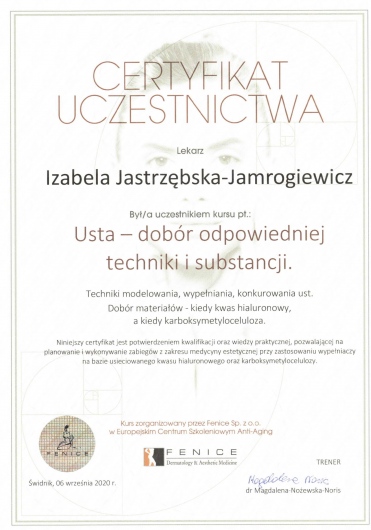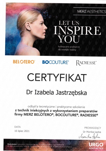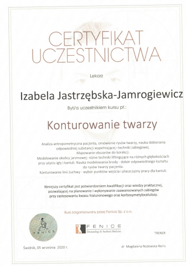Śledzi trendy w nowoczesnej medycynie estetycznej podnosząc kwalifikacje uczestnicząc w licznych kursach,szkoleniach i kongresach.
