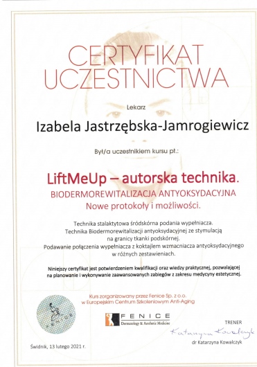 Członek Polskiego Towarzystwa Medycyny Estetycznej i Anti-aging.