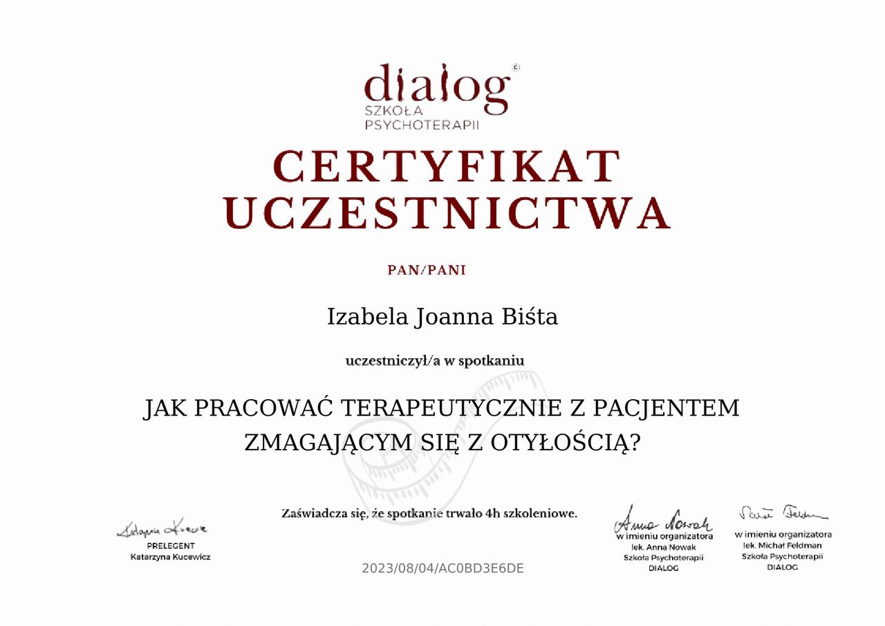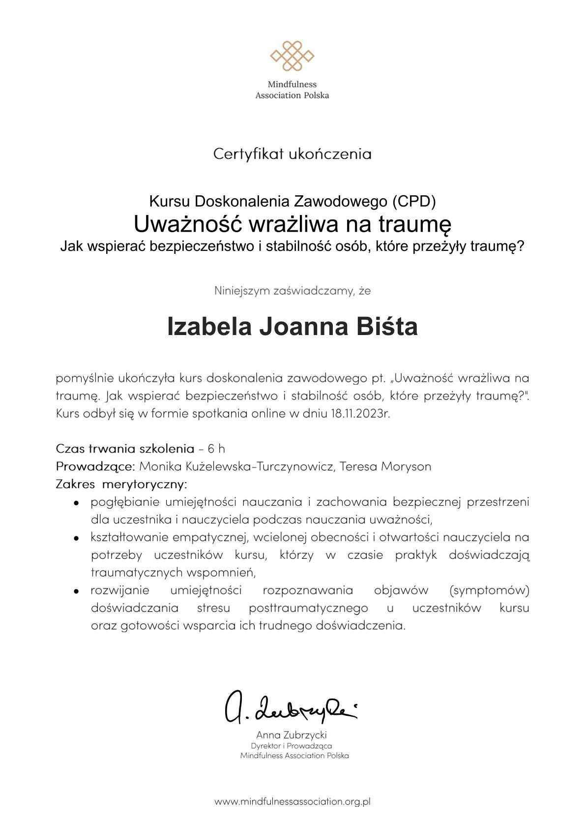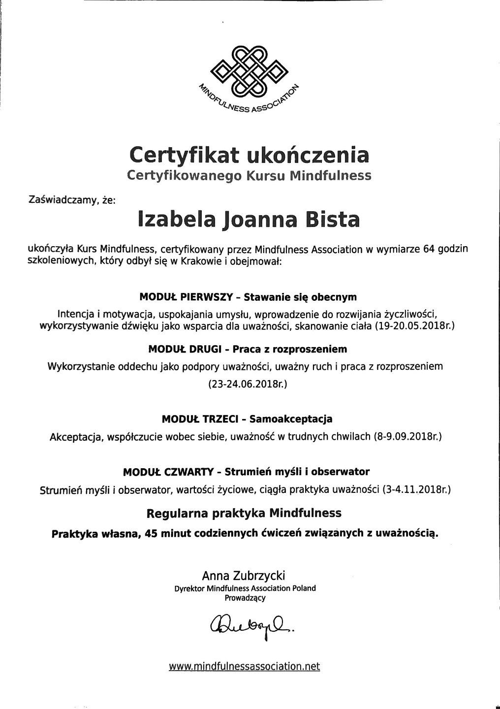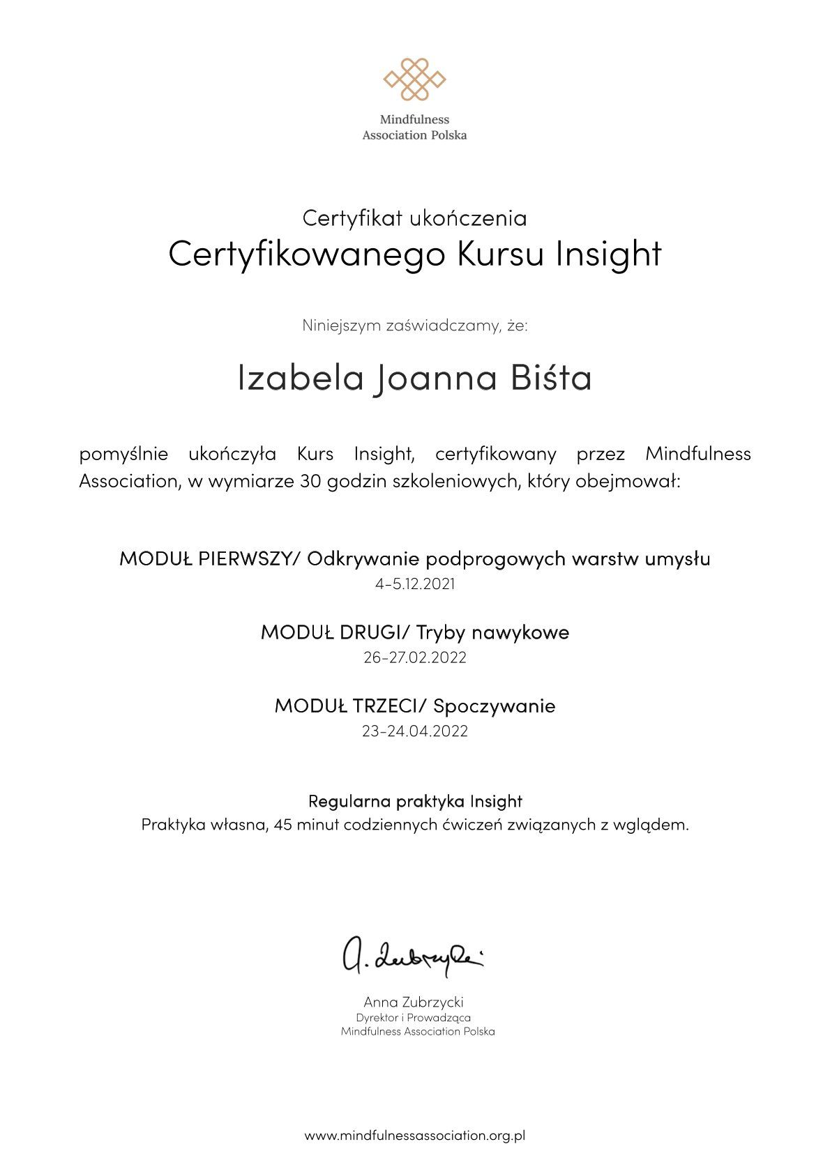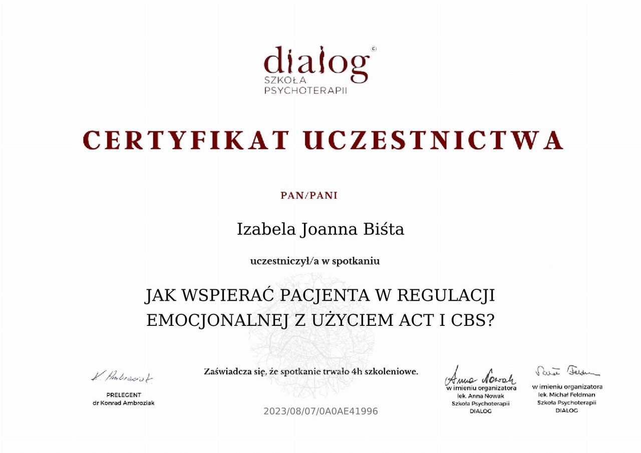 Zdecydowanie polecam! Pani Izabela Biśta jest sympatyczną, ciepłą osobą; zaangażowanym, dociekliwym, spostrzegawczym i pełnym profesjonalizmu specjalistą. Czas podczas sesji jest efektywnie wykorzystany. Okazało się, że trudność z którą się zgłosiłam jest tylko efektem rzeczywistego problemu, który udało się Pani Izabeli zdiagnozować. Po kilku miesiącach terapii widzę efekty w codziennym życiu. Cieszę się, że na swojej drodze spotkałam właśnie Panią.