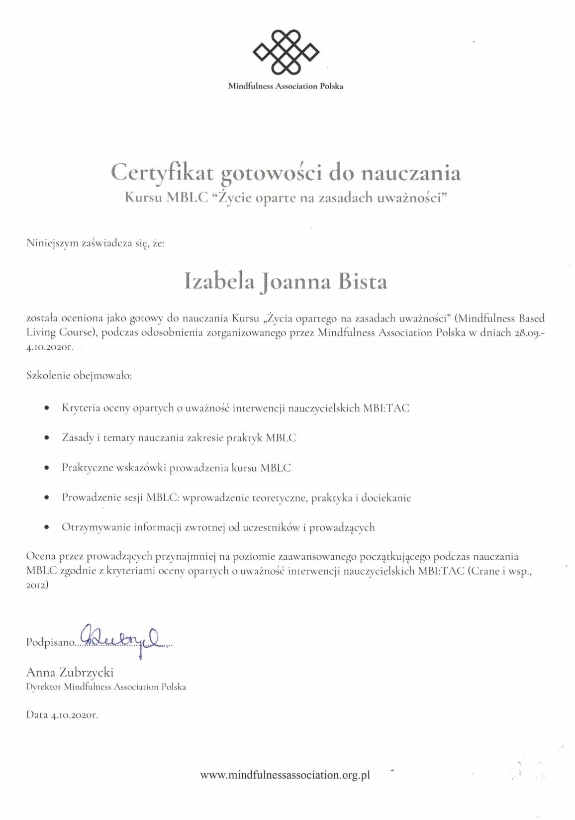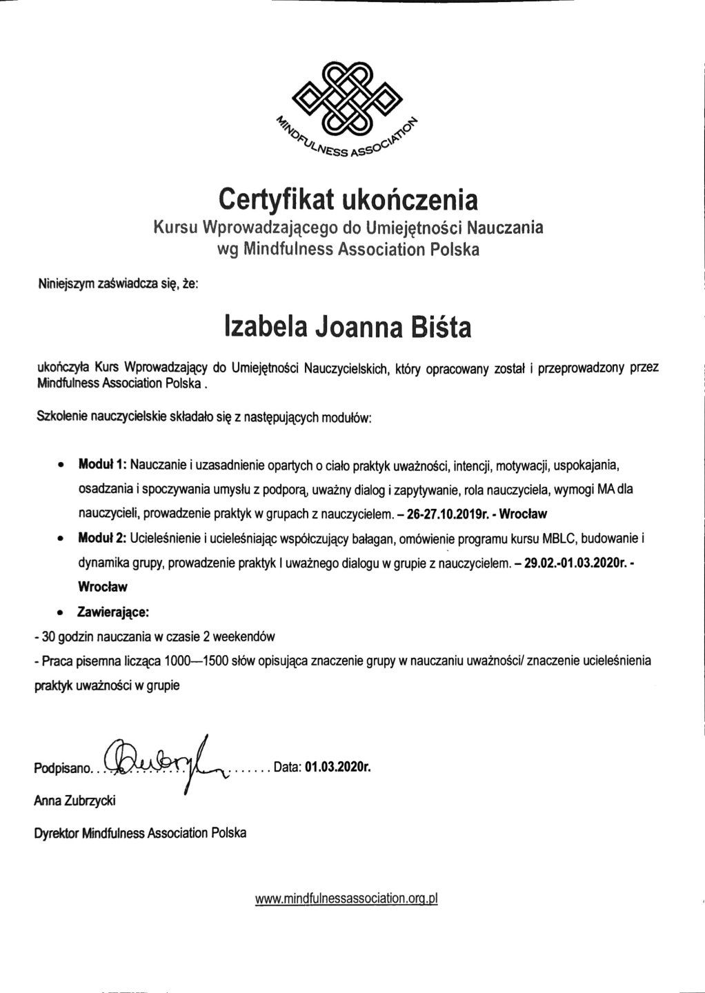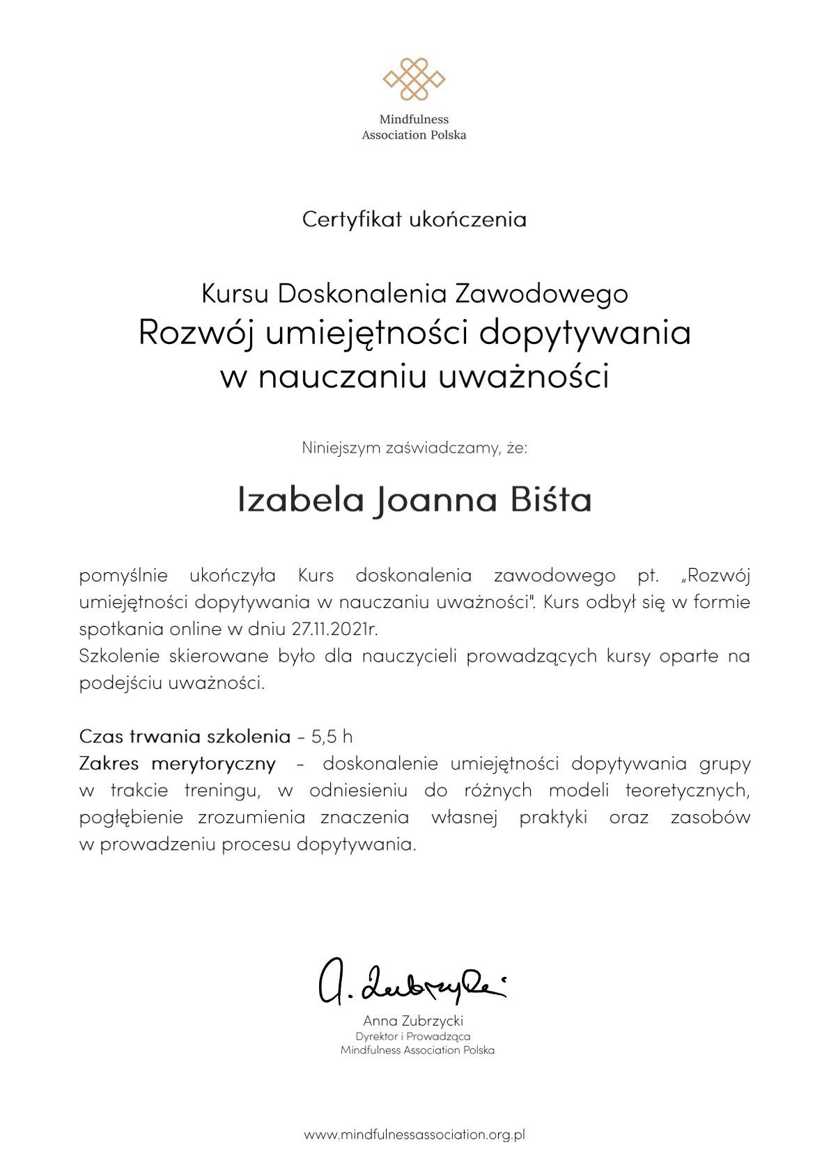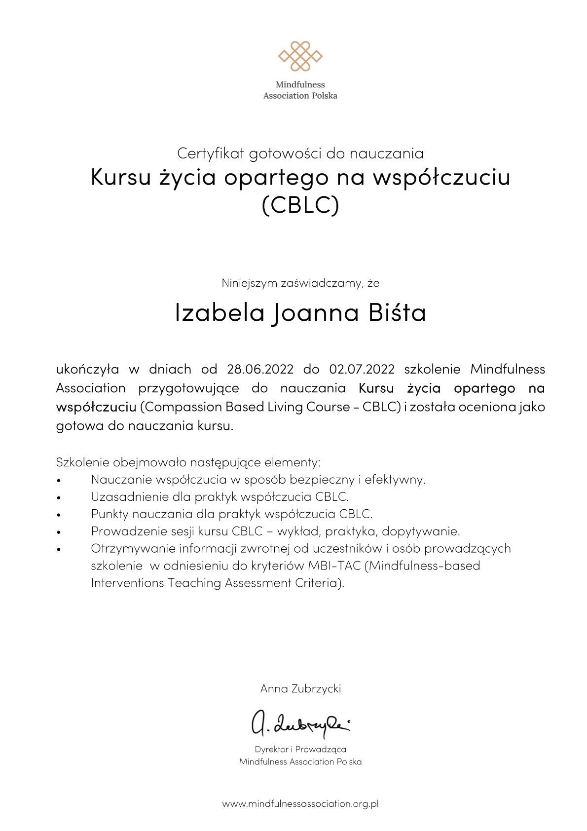 Zdecydowanie polecam! Pani Izabela Biśta jest sympatyczną, ciepłą osobą; zaangażowanym, dociekliwym, spostrzegawczym i pełnym profesjonalizmu specjalistą. Czas podczas sesji jest efektywnie wykorzystany. Okazało się, że trudność z którą się zgłosiłam jest tylko efektem rzeczywistego problemu, który udało się Pani Izabeli zdiagnozować. Po kilku miesiącach terapii widzę efekty w codziennym życiu. Cieszę się, że na swojej drodze spotkałam właśnie Panią.